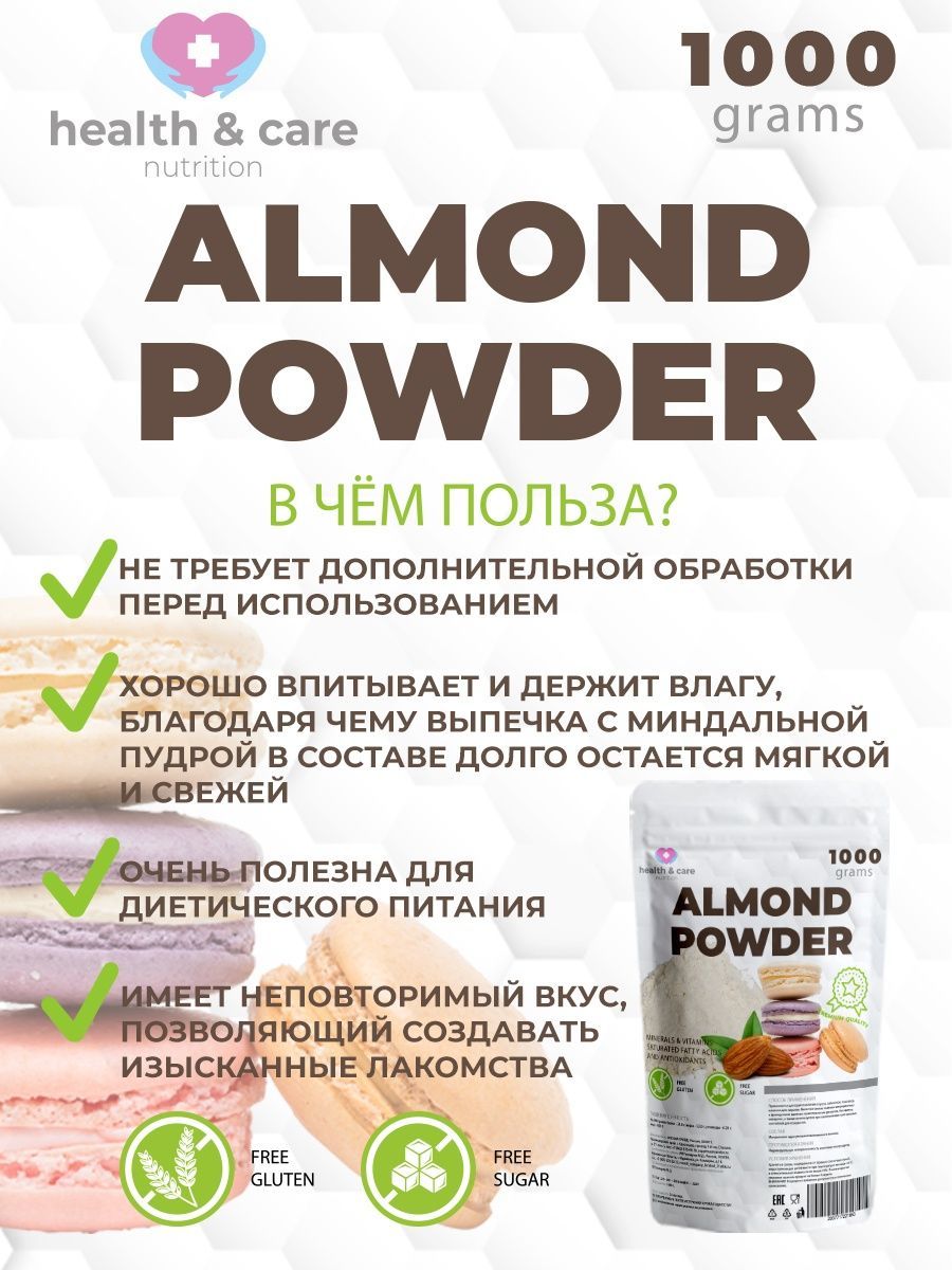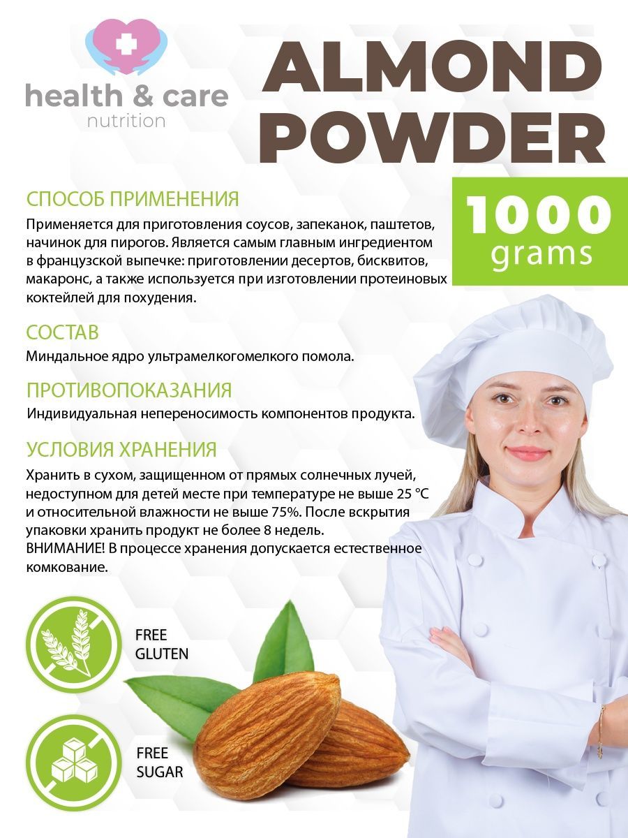 Описание: Миндальная ПУДРА от Health & care - это миндальный орех в ультра тонком помоле. В муке из миндаля мелкого помола содержится калий фосфор магний кальций железо витамин E который является хорошим антиоксидантом позволяющим защитить клетки организма от негативных воздействий и предотвратить развитие тяжелых заболеваний. Кроме этого, витамин E снижает уровень холестерина в организме и плюс укрепляет иммунитет. Также в муке миндальной содержатся витамины группы B играющие очень важную роль в метаболизме человека. Наша миндальная мука без глютена, она отлично подходит для приготовления диетической выпечки (например, макаруны пирожные, печенье), можно даже на кето! Ее можно добавлять в состав диетического коктейля для похудения. Мука миндальная стопроцентная, из бланшированного миндаля. В ней содержатся практически вся линейка витаминов группы В, холин, бета каротин кальций магний, фосфор железо хлор сера калий, биологически активные компоненты антиоксиданты и фитоэстрогены, а также витамин Е, укрепляющий иммунитет человека. Отличная еда . Миндальная мука проходит несколько этапов изготовления. Первый этап заключается в отборе миндаля, только крупные и качественные орехи. На втором этапе снимается верхняя пленка, затем плоды отправляются на сушку. После этого миндаль отправляется на помол, благодаря такой обработке миндальная мука сохраняет в себе все полезные микроэлементы и антиоксиданты. Ее часто добавляют в тесто или крем что бы создавать десерты с неповторимым вкусом и ароматом Используется для приготовления множества десертов: пирожных макарон, печенья, кексов и т.д.