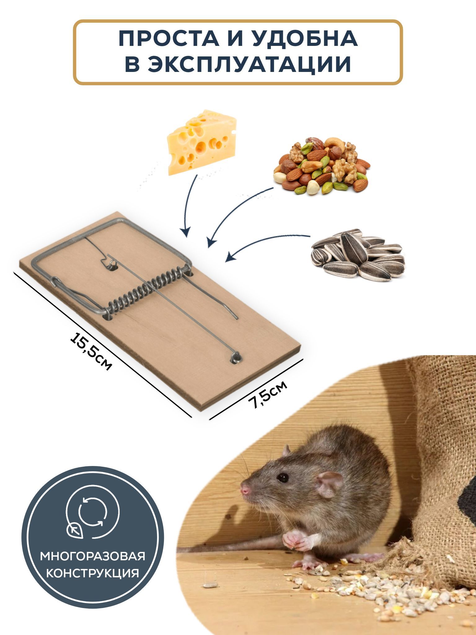 По сравнению с другими моделями, деревянная крысоловка проста в использовании. Вам не понадобятся никакие специальные навыки или инструменты. Достаточно просто установить ее в месте, где часто появляются грызуны, и результат не заставит вас ждать. Наша крысоловка - это надежный способ избавления от нежелательных посетителей.