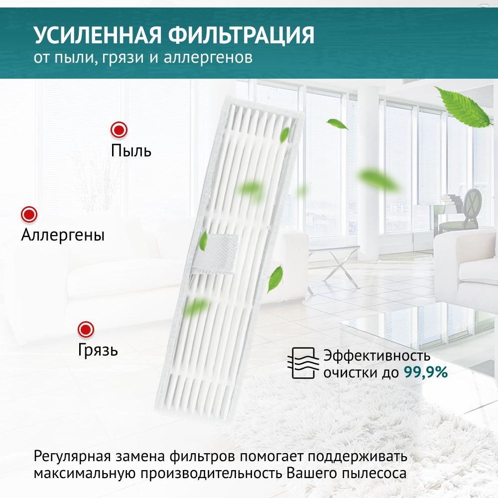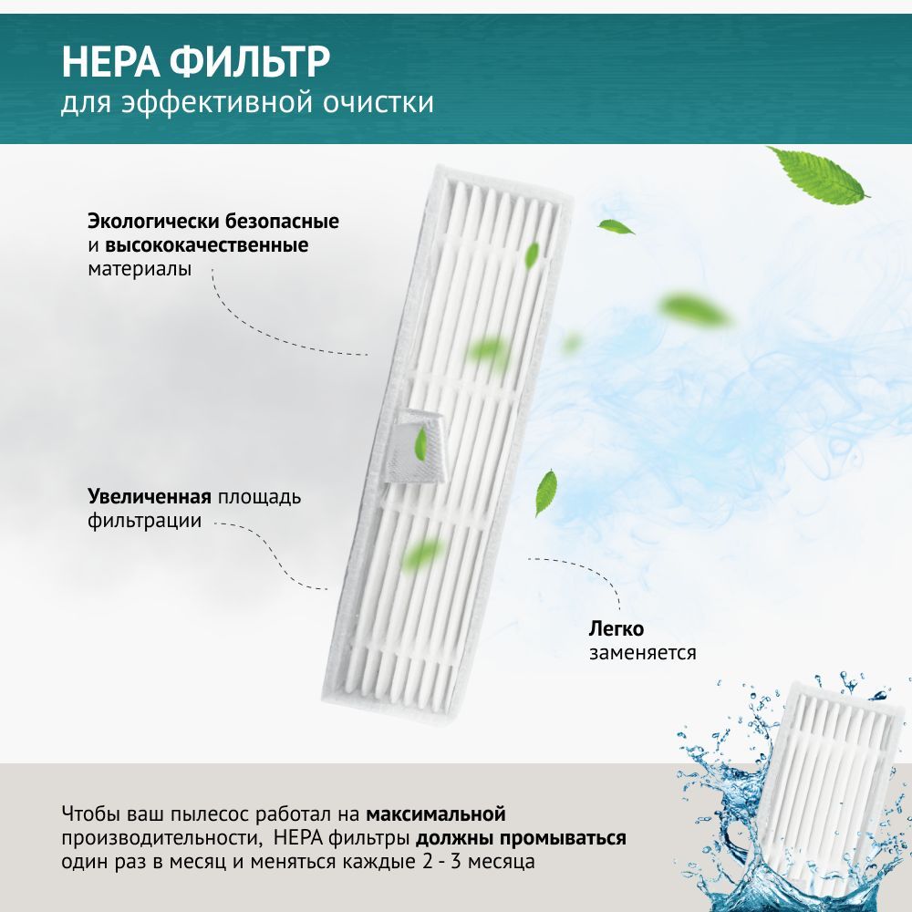 Фильтр имеет увеличенную площадь фильтрации, задерживает мельчайшие частицы пыли и мусора, обеспечивая удаление аллергенов. Фильтр изготовлен по технологии НЕРА.
