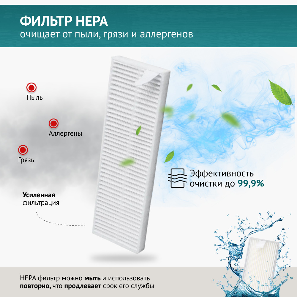 Фильтр имеет увеличенную площадь фильтрации, задерживает мельчайшие частицы пыли и мусора, обеспечивая удаление аллергенов.