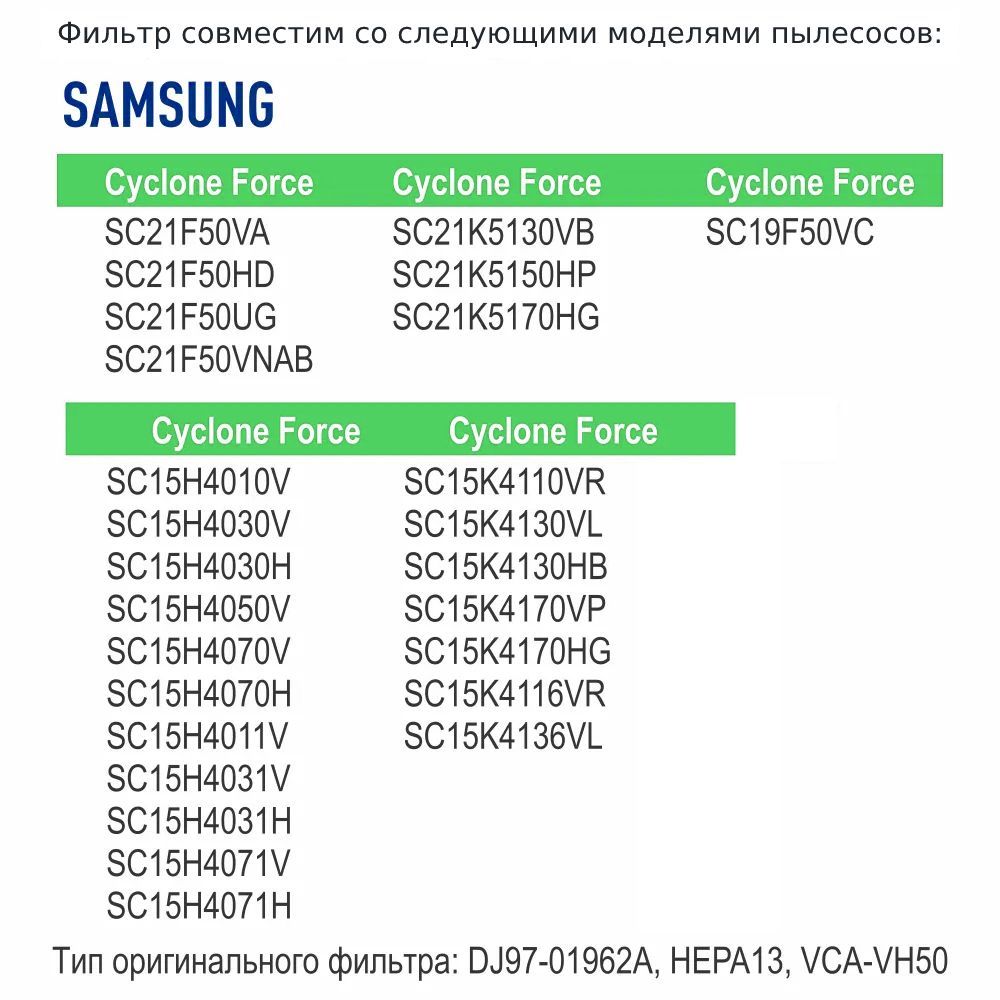 Данная модель HEPA фильтра совместима со следующими моделями пылесосов SAMSUNG серий: