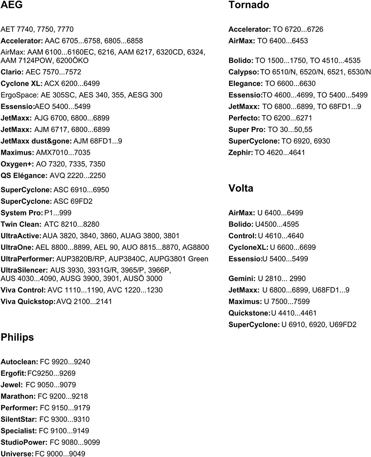 • Accelerator, Airmax, Bolido, Clario, Ergospace, Ergospace, Excellio, Jetmaxx, Maximus, Oxy3system, Oxygen, Scanimal, Scorigin, Scparkett, Smartvac, Ucorigin, Ultraflex, Ultraone, Ultraperformer.