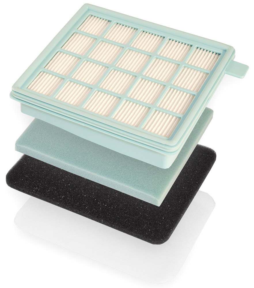 "1 НЕРА фильтр в пластиковом корпусе уровня фильтрации НЕРА Н 12; 1 моторный фильтр; 1 губчатый выходной фильтр; 1 микрофильтр"
