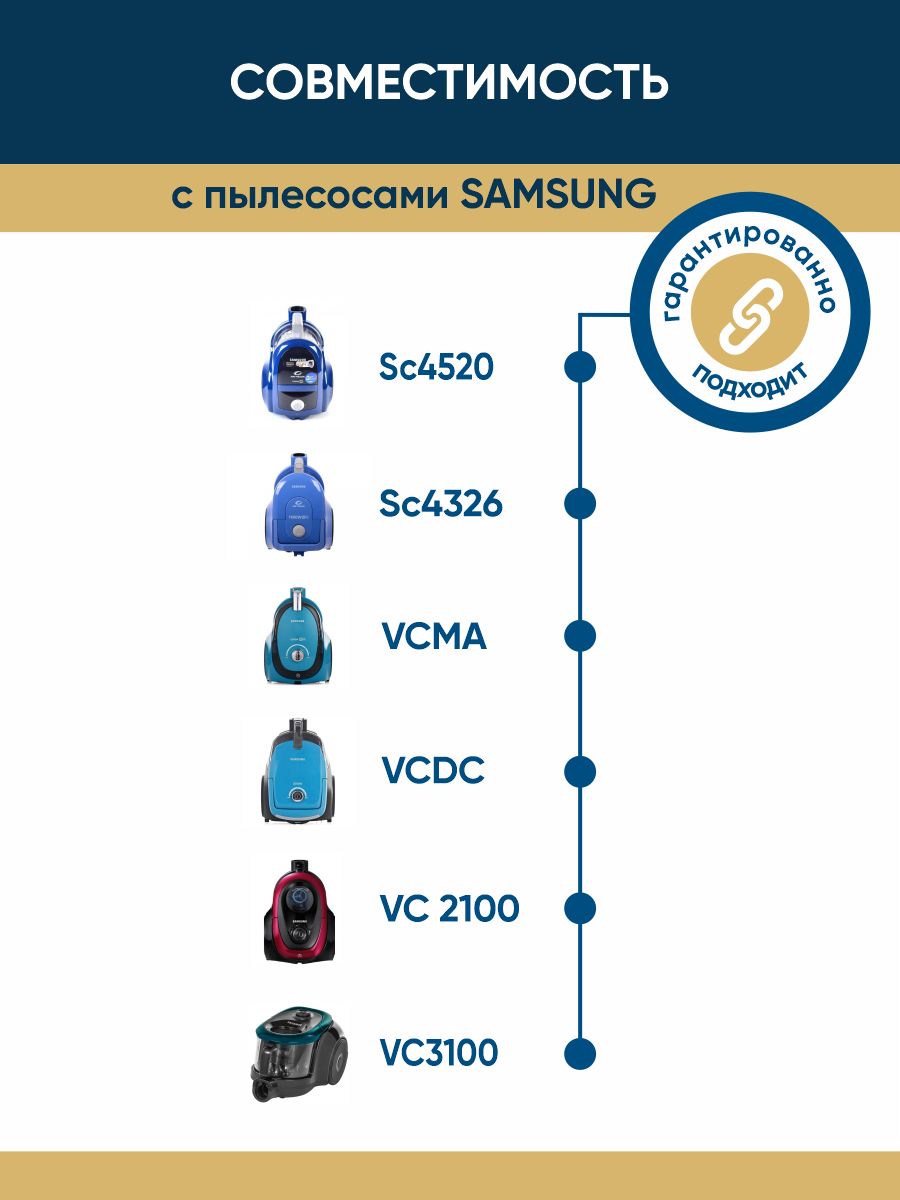 • Совместимость фильтров (для упрощения поиска модели, откройте товар в браузере и с помощью команды CTRL+F вбейте модель пылесоса):Samsung SC43…, Samsung SC44…, Samsung SC45…, Samsung SC47..., Samsung VCDC20…, Samsung VCMA16…, Samsung VCMA18…