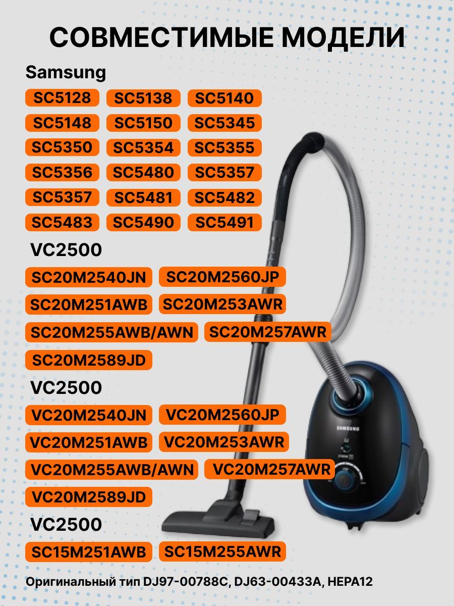 Фильтр обладает высочайшей степенью фильтрации, задерживает 99,5% пыли. Благодаря специальным свойствам фильтрующего материала, фильтр доя пылесоса улавливает мельчайшие частицы, позволяя очищать воздух от пыльцы, микроорганизмов, бактерий и пылевых клещей.. Уборка дома принесёт больше удовольствия и эффекта, если в Вашем пылесосе установлен новый фильтр. Владельцы пылесосов Samsung могут купить различные аксессуары для своих устройств. Один из таких аксессуаров - это HEPA фильтр для пылесоса Samsung. Хепа фильтр для Самсунга обеспечивает более эффективную фильтрацию воздуха и ловит до 99,97% мельчайших частиц пыли и аллергенов. Кроме того, доступны губки и губчатые фильтры для пылесоса Samsung, например, губка легко устанавливается и обеспечивает защиту от пыли и загрязнений. Фильтры на Самсунг помогут сохранить эффективность пылесоса, это защита от повреждений и износа. Некоторые из них могут быть совместимы с другими моделями пылесосов Samsung - изучите слайды со списком моделей.