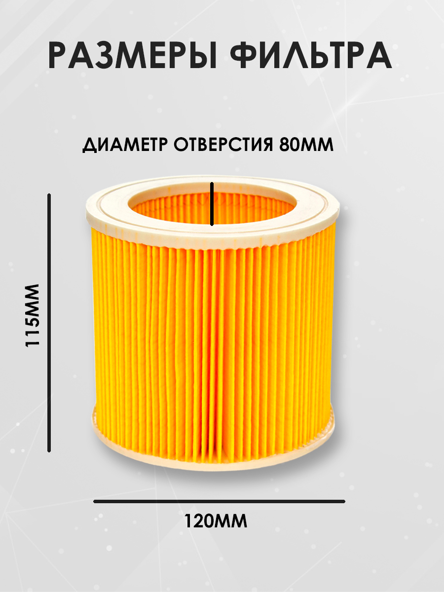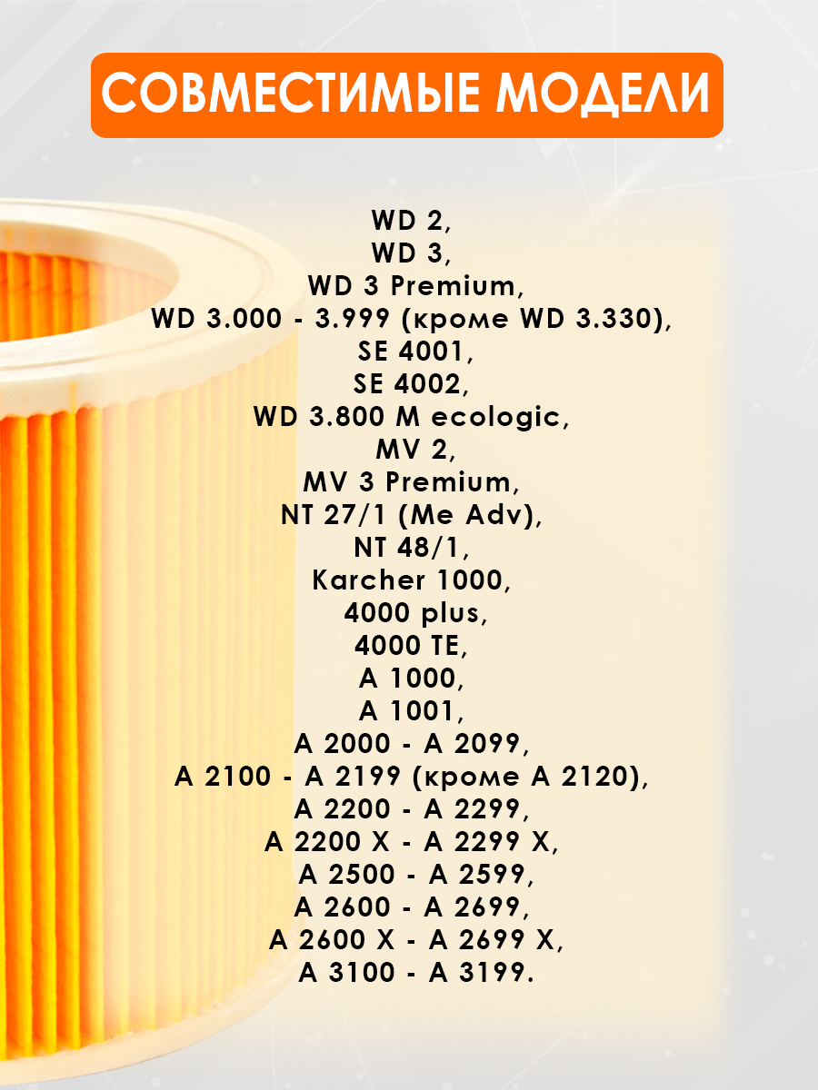 Описание: Фильтр для пылесоса керхер (Karcher) изготовлен из высококачественных материалов. Эффективность очистки до 99%. Моторный фильтр керхер обеспечит эффективную очистку воздуха, значительно уменьшая попадание пыли, пыльцы, продукты жизнедеятельности домашних животных и других аллергенов в воздух, которым вы дышите. Легко снимается и заменяется как часть обычного обслуживания.Рекомендации: чтобы ваш пылесос для дома работал с максимальной отдачей, необходимо промывать фильтры один раз в месяц и меняться каждые 2 - 3 месяца.Круглый фильтр совместим с моделью Kercher: A 2000-2099, A 2204-2299, A 2500-2599, A 2600-2699, MV 2, MV 3 Premium, NT 27/1, NT 48/1, SE 4001, SE 4002, WD 2, WD 2.000-WD 2.999, WD 3.000-WD 3.999, 1000, 4000 Plus, 4000 TE, A 1000, A 1001, A 2100-2199, WD 3, WD 3 Car, WD 3 P, WD 3 Premium, karher A 2200-2299, A 2200 X-2299 X, Карчер A 2600 X-2699 X, A 3100-3199, WD 2 Home, NT 27/1 Me, NT 27/1 Me Adv, kerher. В нашем магазине x8 group вы можете найти аксессуары для бытовой техники: мешки, щетки, тряпки и сменные фильтры
