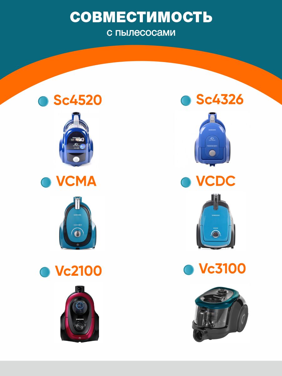 • Совместимость фильтров (для упрощения поиска модели, откройте товар в браузере и с помощью команды CTRL+F вбейте модель пылесоса):Samsung SC43…, Samsung SC44…, Samsung SC45…, Samsung SC47..., Samsung VCDC20…, Samsung VCMA16…, Samsung VCMA18…