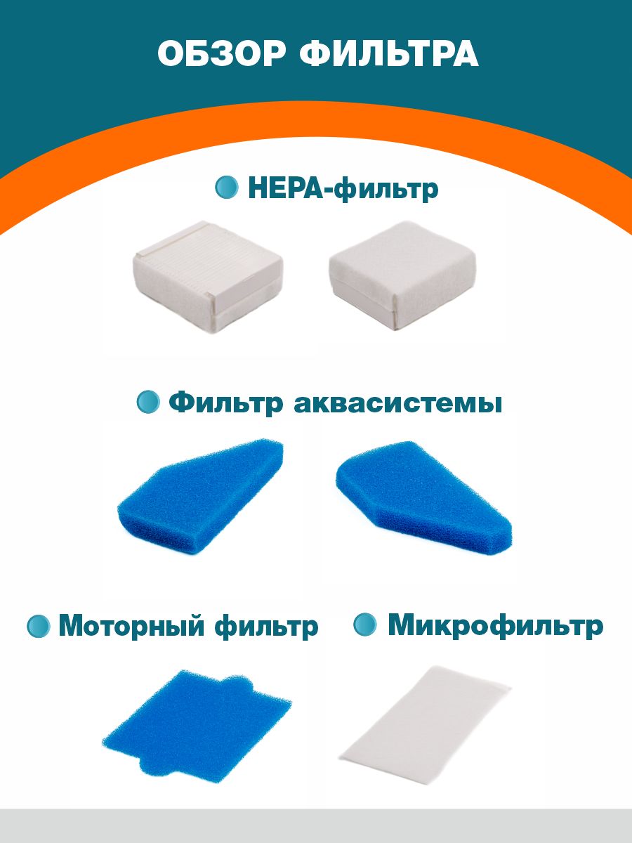 1 НЕРА фильтр уровня фильтрации НЕРА Н 10; 2 фильтра аквасистемы; 1 моторный фильтр; 1 микрофильтр