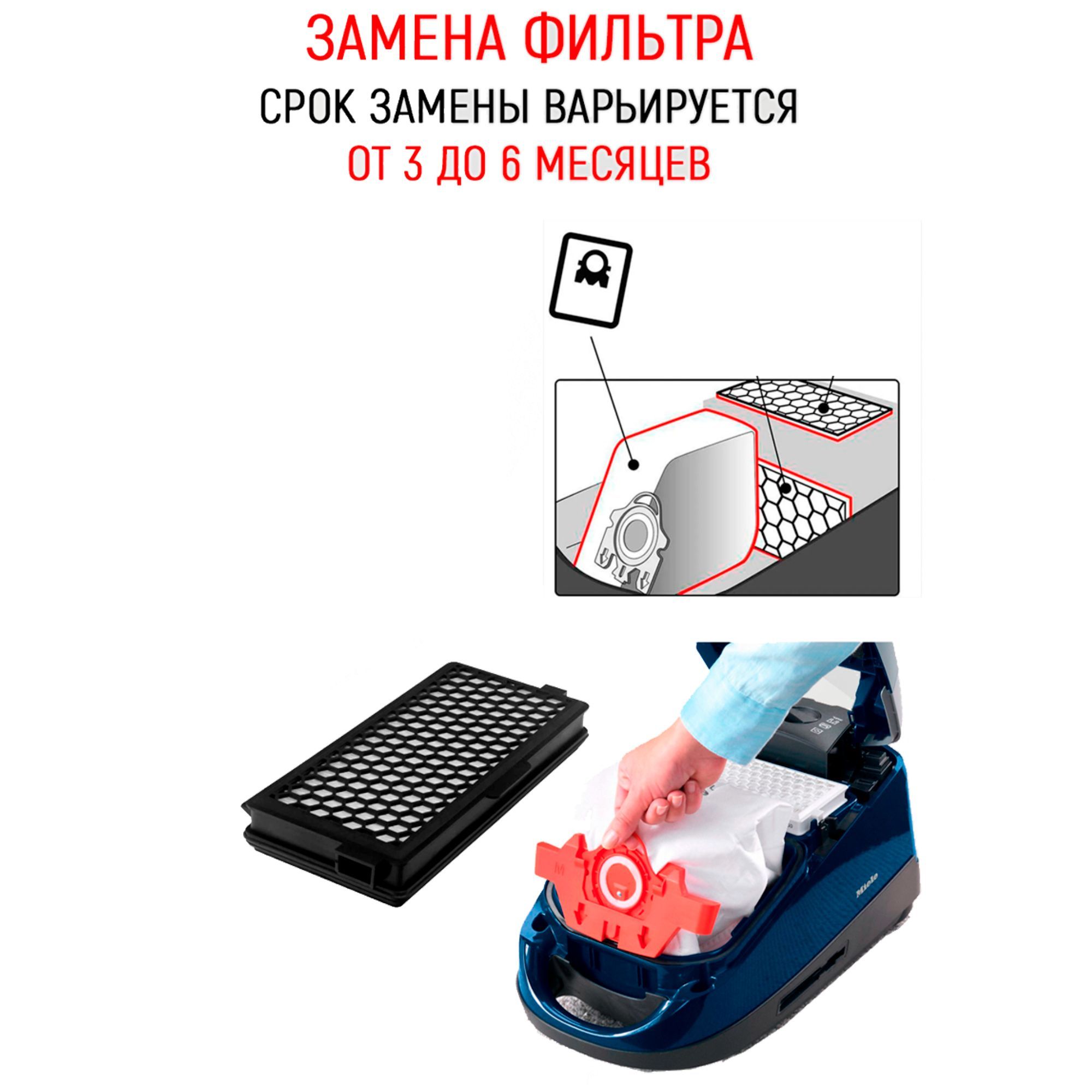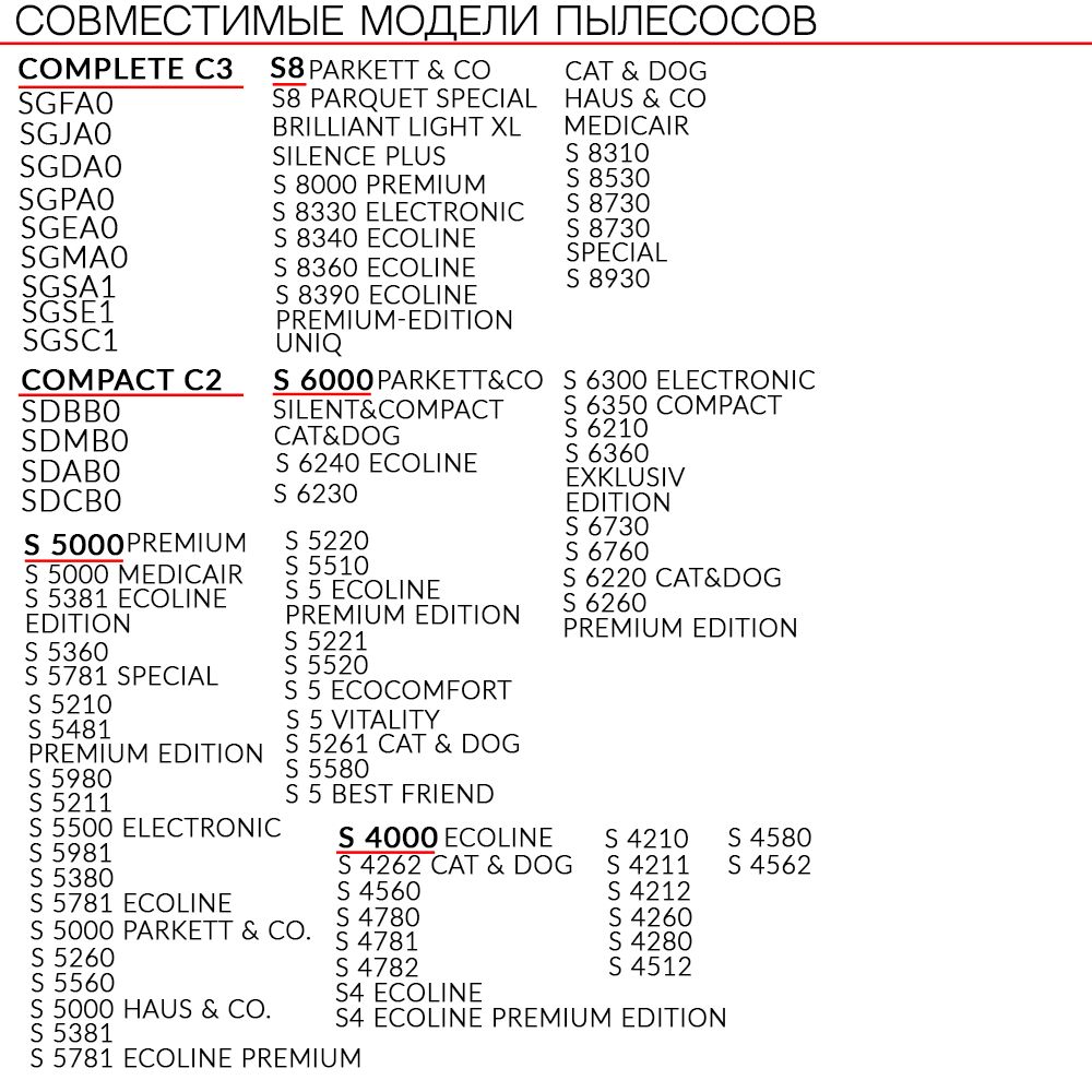 Для пылесосов Miele S4210 – S4812, S5210 – S5981, S6210 – S6780, S8310 – S8990, Compact C1-C2, Complete C2-C3
