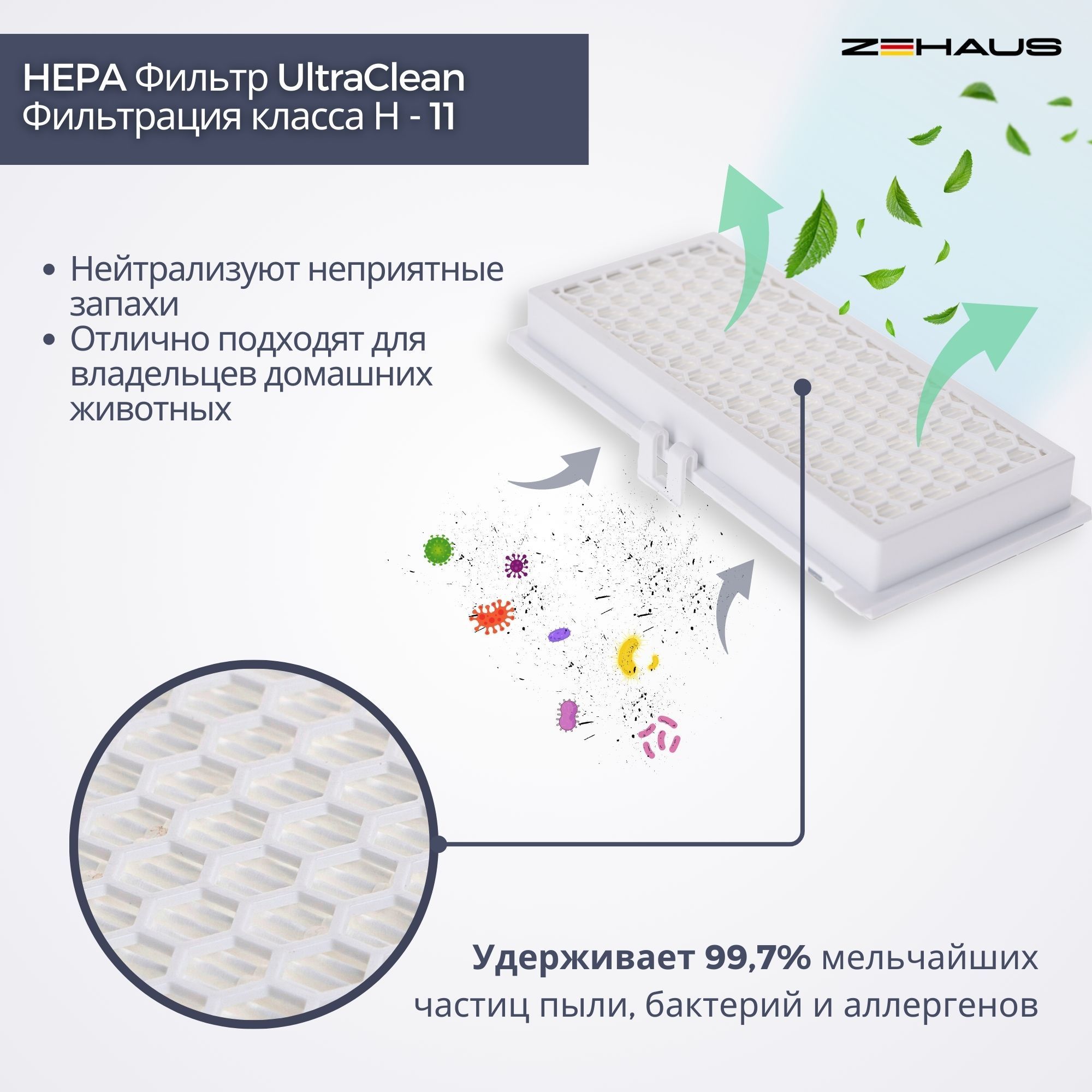 HEPA Фильтр обеспечивает эффективную очистку воздуха, значительно уменьшая попадание пыли, пыльцы, и неприятные запахи. Задерживает 99,7% мельчайших частиц пыли, и других аллергенов в воздух, это позволяет сделать дом более чистым и комфортным.