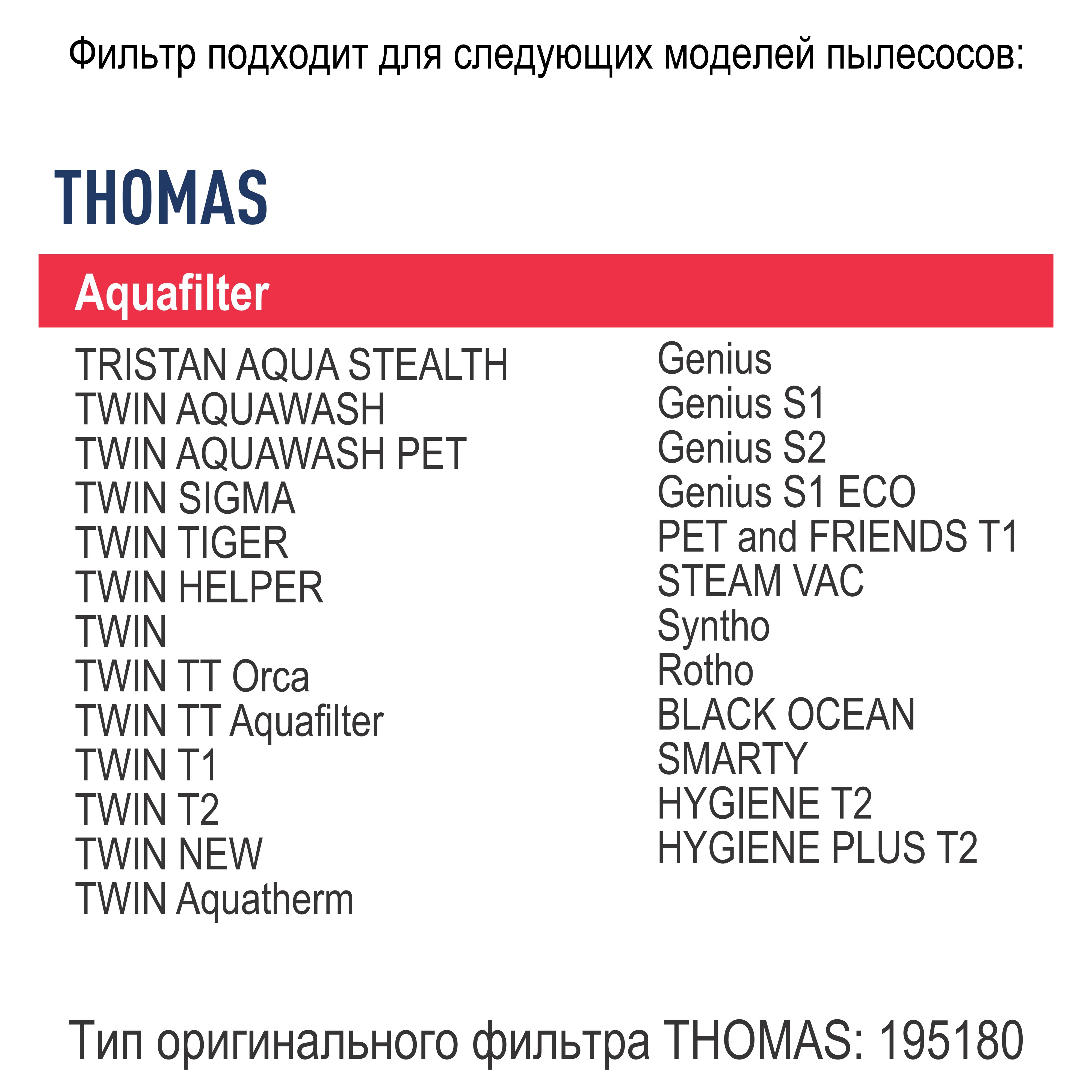 Описание: HEPA-фильтр для пылесосов THOMAS. Обладает высочайшей степенью фильтрации, задерживает 99,5% пыли. Благодаря специальным свойствам фильтрующего материала, фильтр улавливает мельчайшие частицы, позволяя очищать воздух от пыльцы, микроорганизмов, бактерий и пылевых клещей.Модели и серии пылесосов:THOMAS: TRISTAN AQUA STEALTH, TWIN AQUAWASH ,TWIN AQUAWASH PET, TWIN SIGMA, TWIN TIGER, TWIN HELPER, TWIN, TWIN TT Orca, TWIN TT Aquafilter, TWIN T1, TWIN T2, TWIN NEW, TWIN Aquatherm, Genius, Genius S1, Genius S2, Genius S1 ECO, PET and FRIENDS T1, STEAM VAC, Syntho, Rotho, BLACK OCEAN, SMARTY, HYGIENE T2, HYGIENE PLUS T2