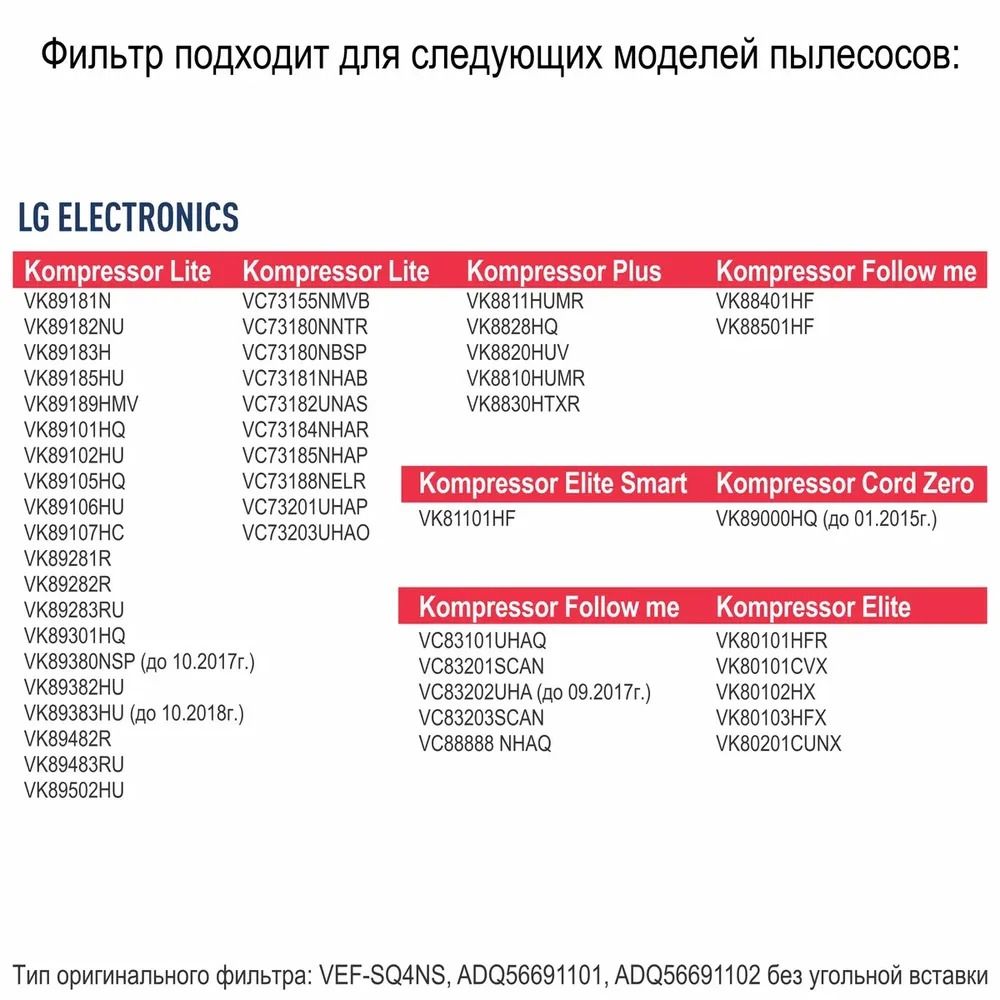 Оригинальный тип фильтра LG: VEF-SQ4NS, ADQ56691102.
