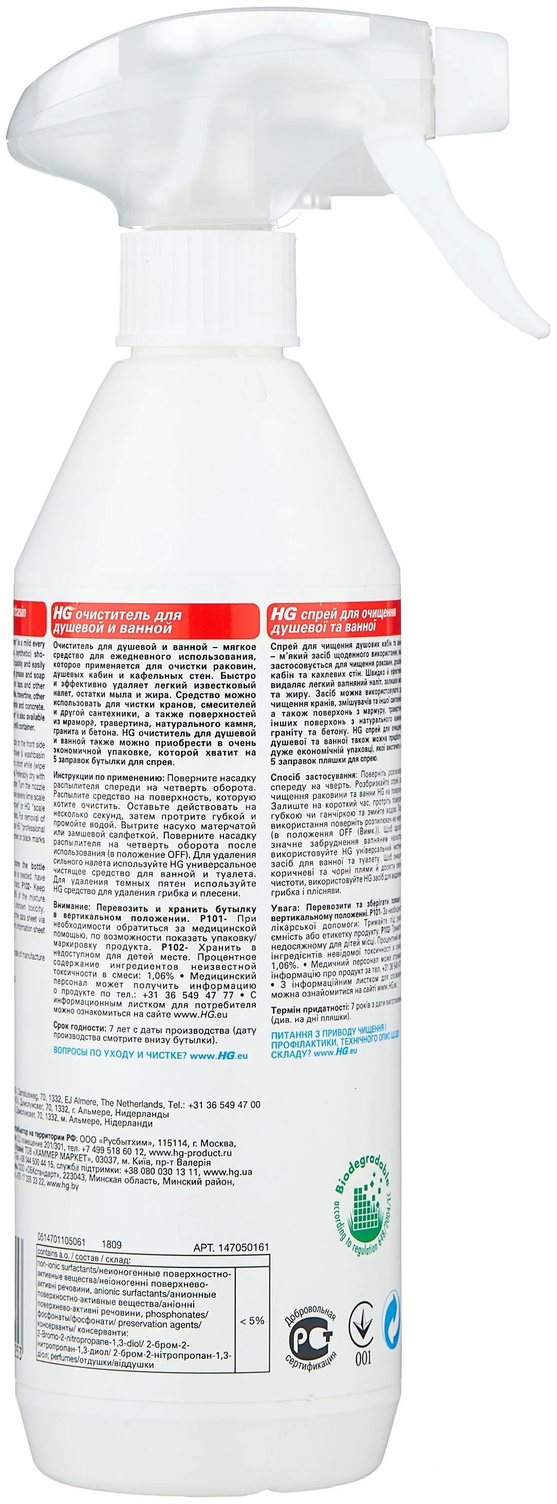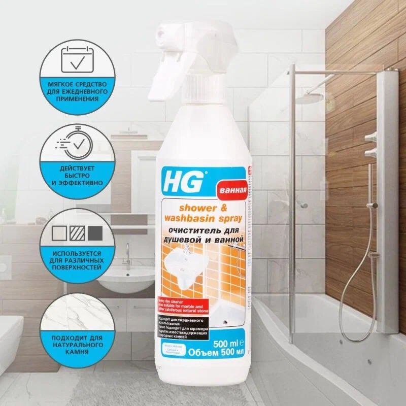 С HG Очистителем вы можете быть уверены, что ваша ванная комната будет всегда чистой и свежей. Он подходит для использования на любых поверхностях, включая плитку, стекло, металл, пластик и многие другие.