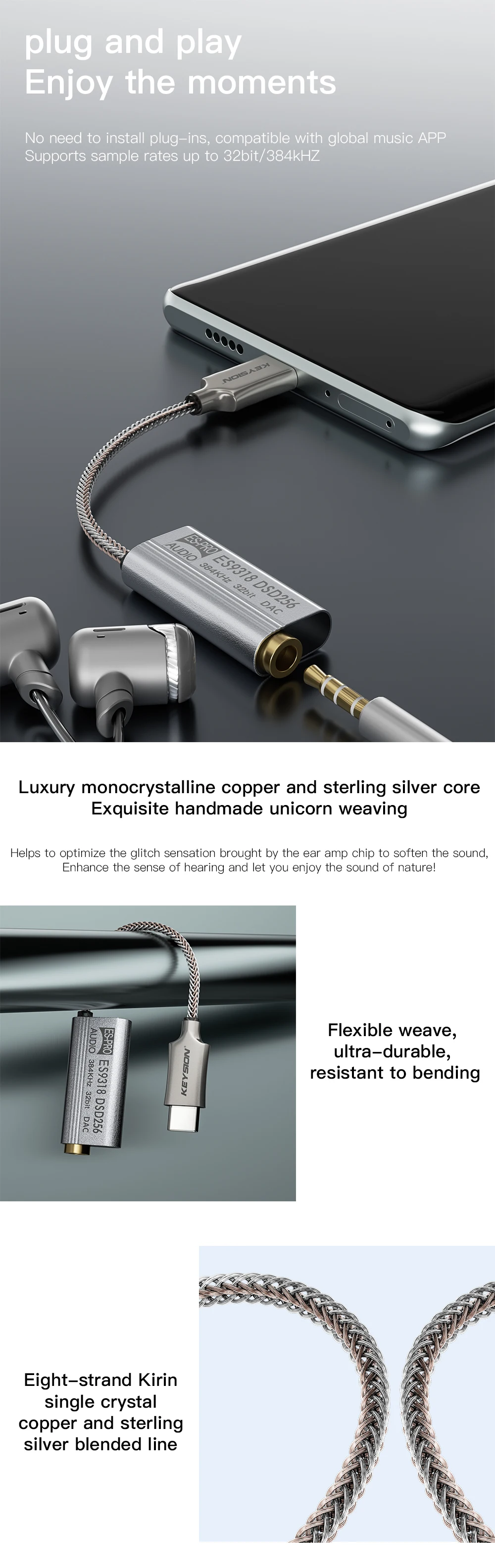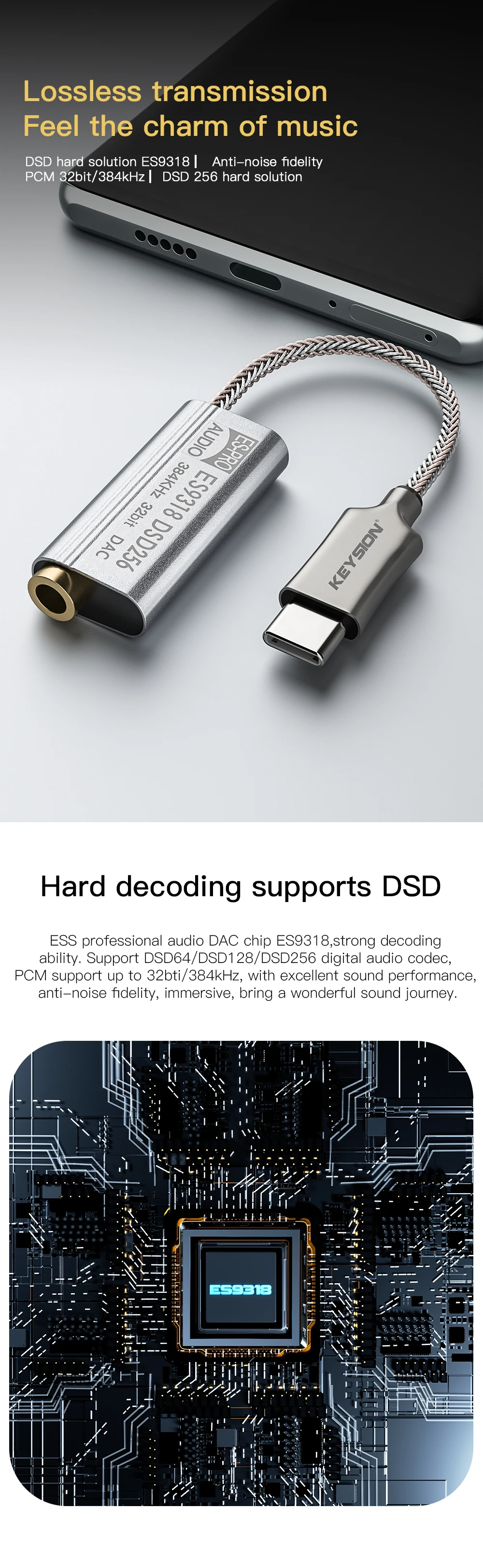 Hi-Fi аудио чип-декодер KEYSION USB TYPE C до 3,5 мм DSD256 32 бит 384 кГц