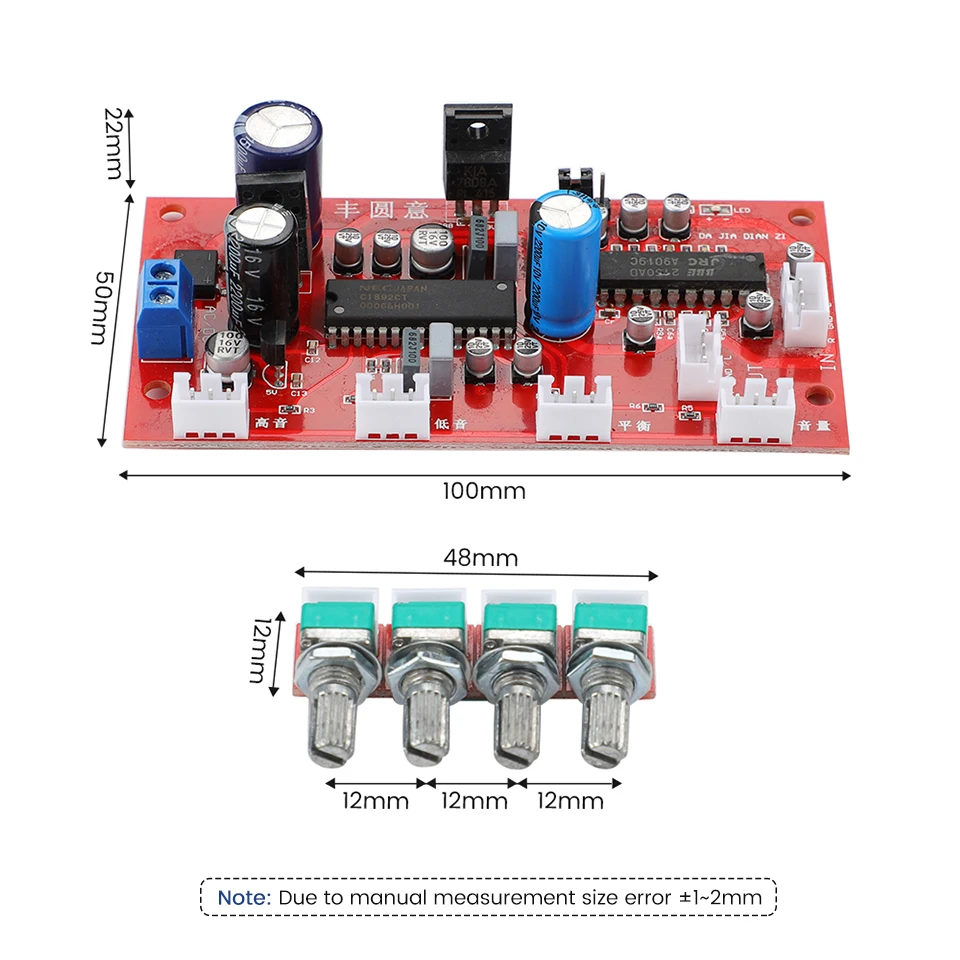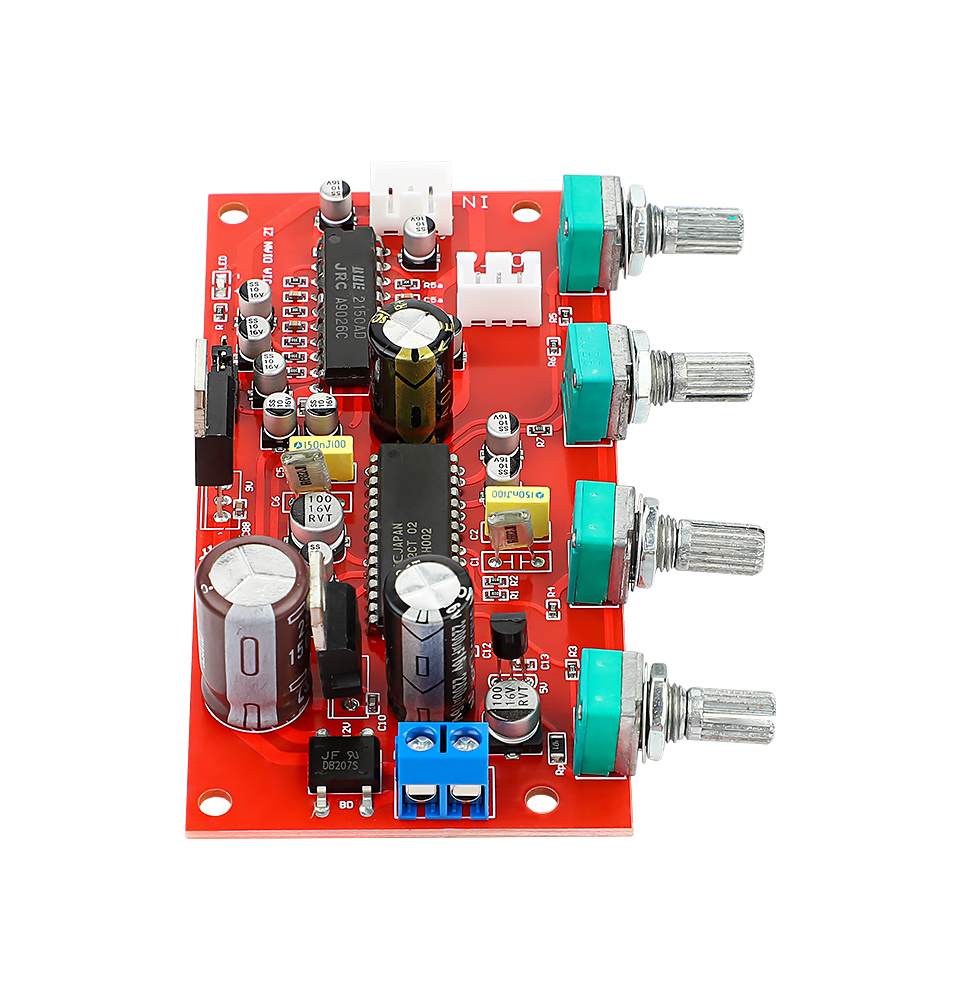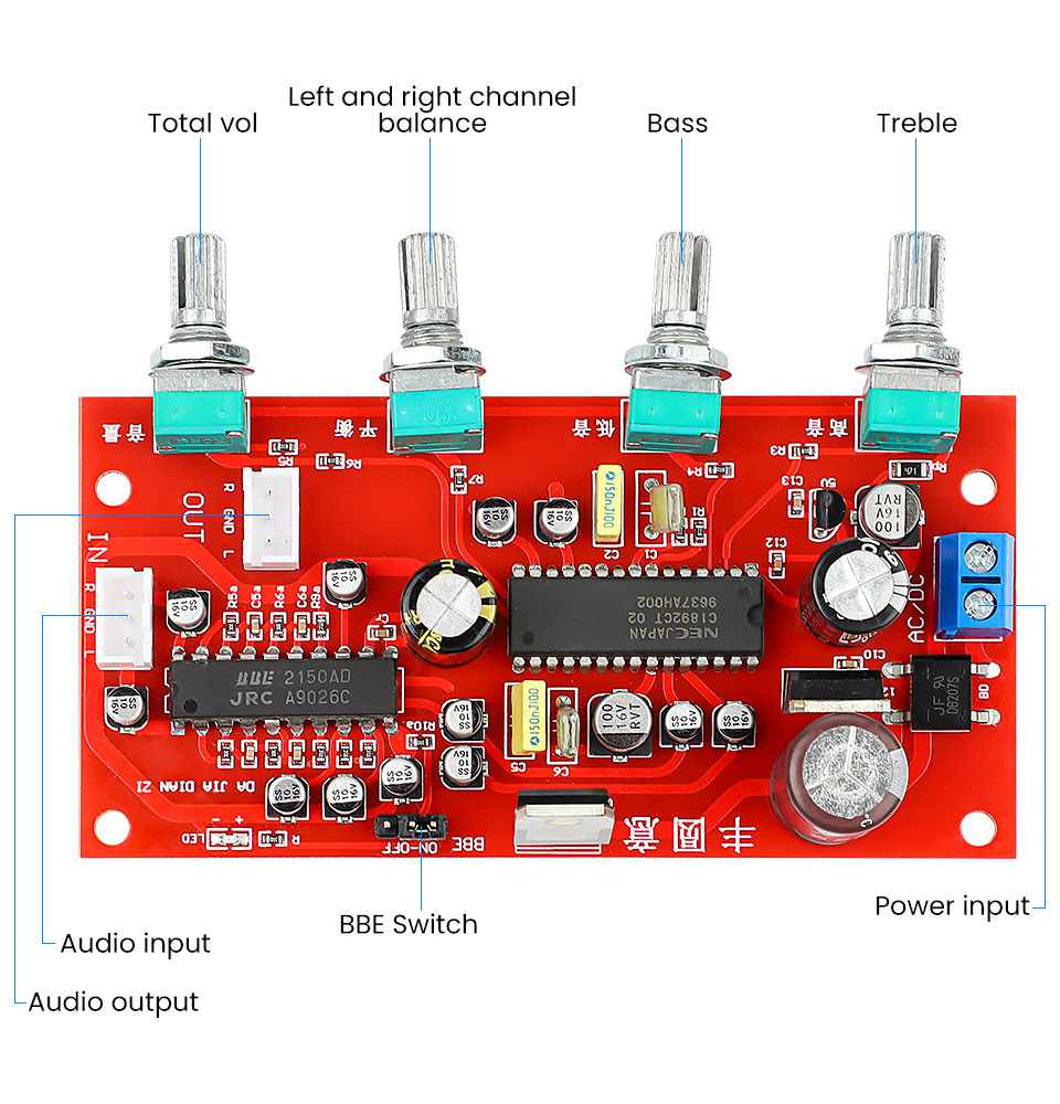 Принять японский upc1892 тон чип + jrc2150bbe чип дизайн, есть высокие частоты, басы, баланс, регулировка громкости, добавить jrc2150bbe чип звукового эффекта, эффективно улучшить кларенность высоких и низких басов, динамический эффект сильнее. Регулировка потенциометра.