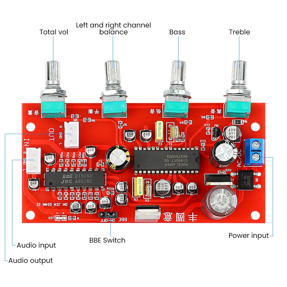 Adopt Japanese upc1892 tone chip + jrc2150bbe chip design, there are treble, bass,balance, volume adjustment, add jrc2150bbe sound effect chip, effectively improve the clarityof high and low bass, the dynamic effect is stronger. The adjustment of the potentiometer.