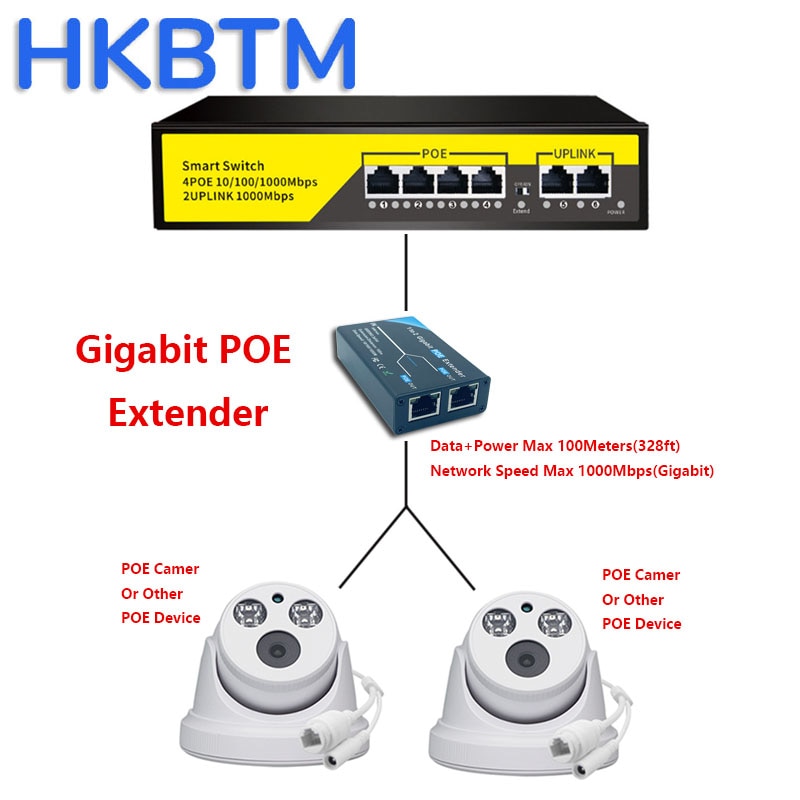 HKBTM Gigabit 2 Порты и разъёмы удлинитель POE, IEEE 802.3af/at PoE + Стандартный, 10/100/1000 Мбит/с, POE ретранслятор 100 метров (328 футов), удлинитель для головок