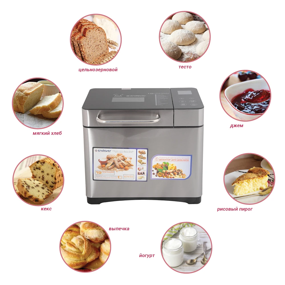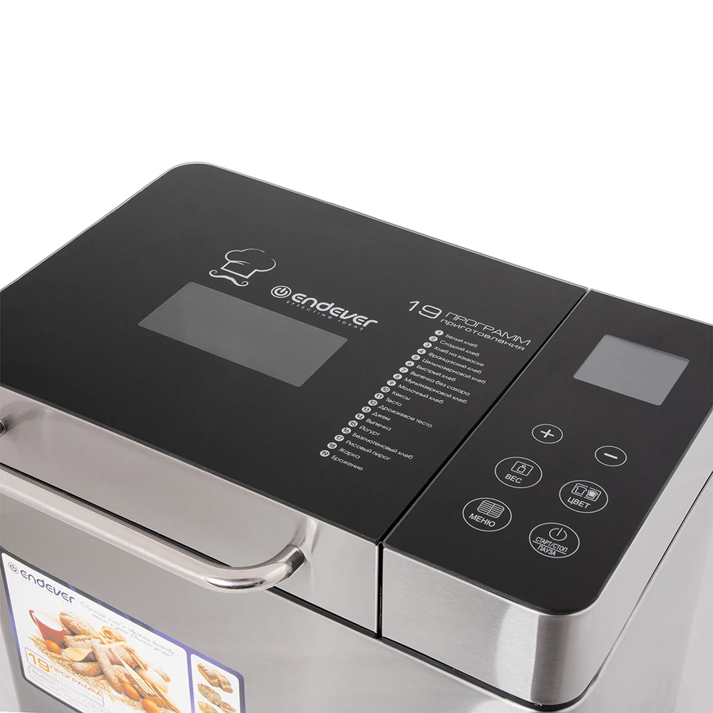 19 автоматических программ приготовления хлеба, в том числе хлеба без глютена, подготовки теста, приготовление джемов и йогуртов. Мощность 710 Вт, таймер отсрочки старта до 15 часов, автоподогрев до 60 минут, на выбор 3 цвета корочки, выбор веса выпечки: 500, 750,1000 грамм. Всё это разнообразит функциональные возможности хлебопечи ENDEVER SkyLine MB-53