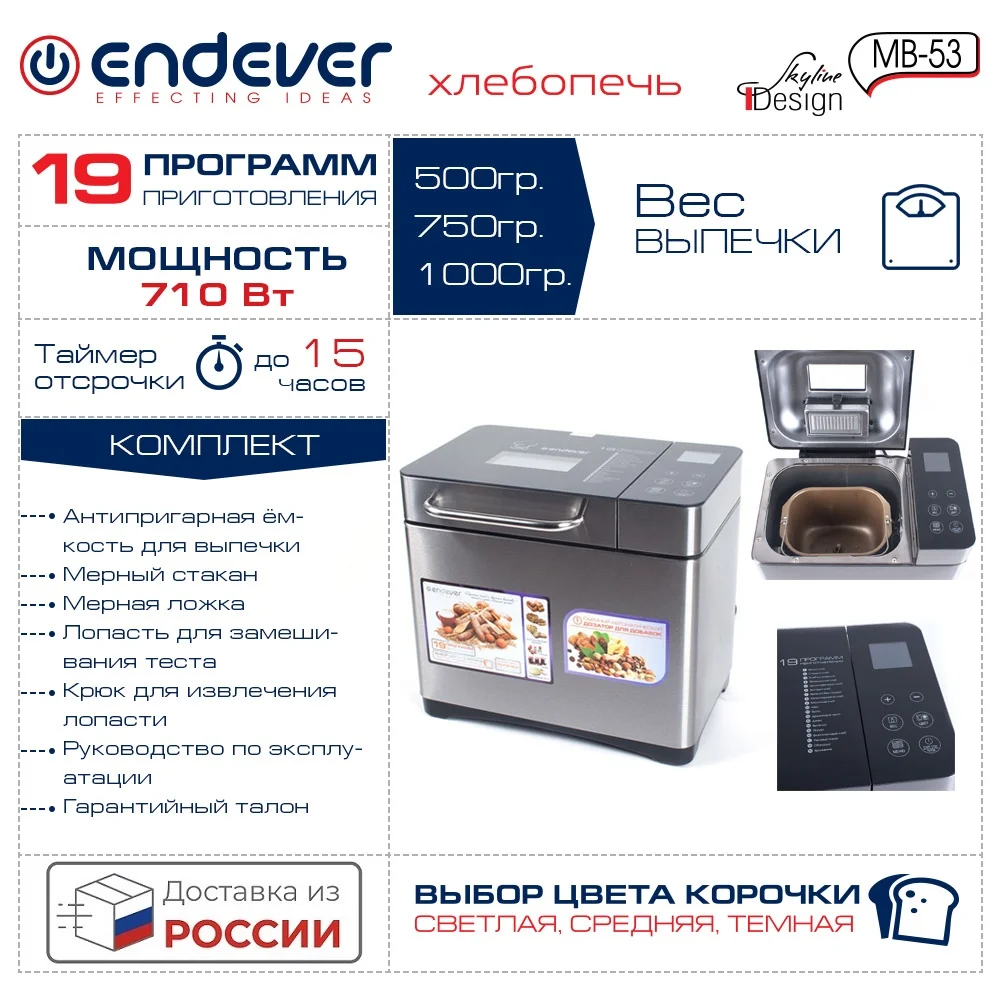 Хлебопечь Endever Skyline MB-53, 19 программ приготовления, Таймер на 15 часов, Автоподогрев: 60 минут, Выбор цвета корочки