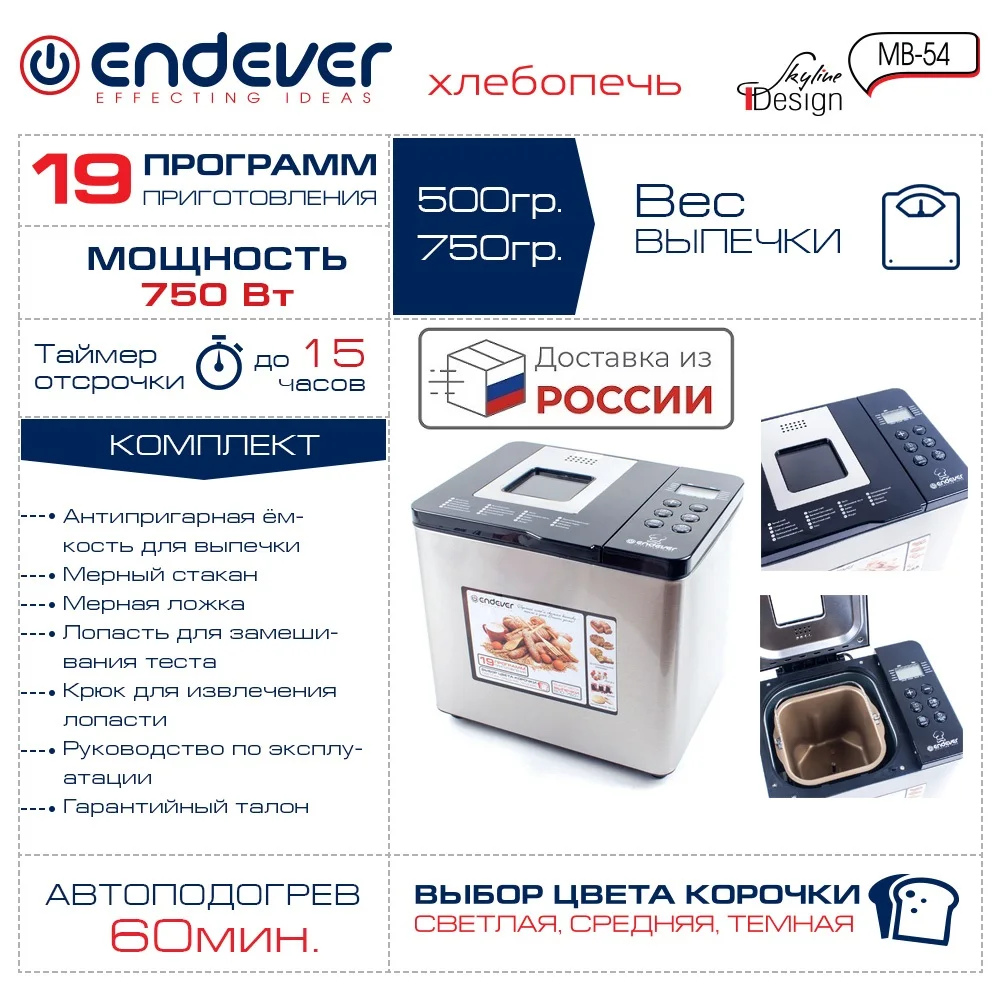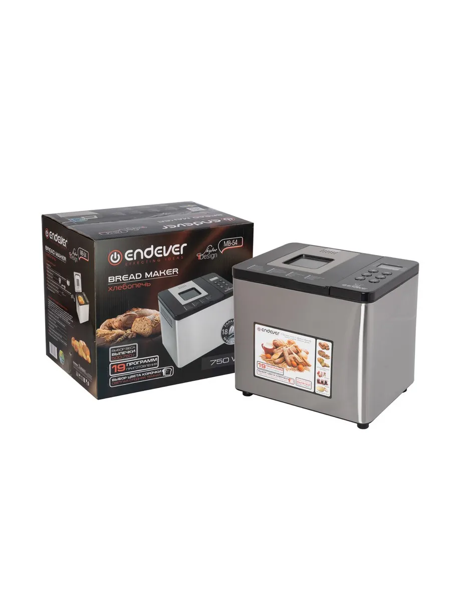 Хлебопечь Endever SkyLine MB-54, 19 программ приготовления, Таймер на 15 часов, Автоподогрев: 60 минут, Выбор цвета корочки