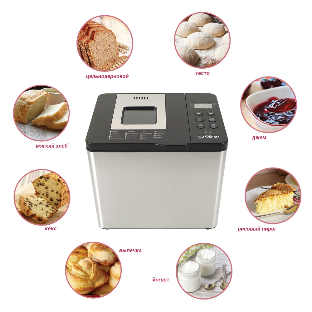 19 программ приготовления: белый хлеб, сладкий хлеб, хлеб на закваске, французский хлеб, цельнозерновой хлеб, быстрый хлеб, выпечка без сахара, мультизерновой хлеб, молочный хлеб, кекс, тесто, дрожжевое тесто, джем, выпечка, йогурт, безглютеновый хлеб, рисовый пирог, обжарка, брожение,