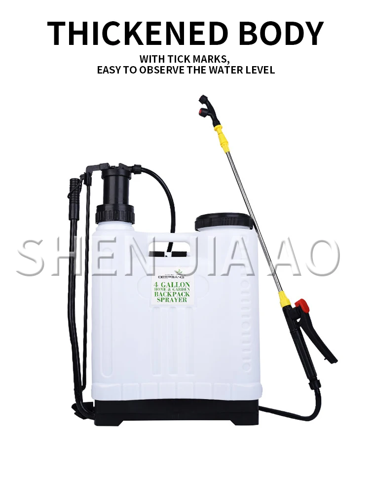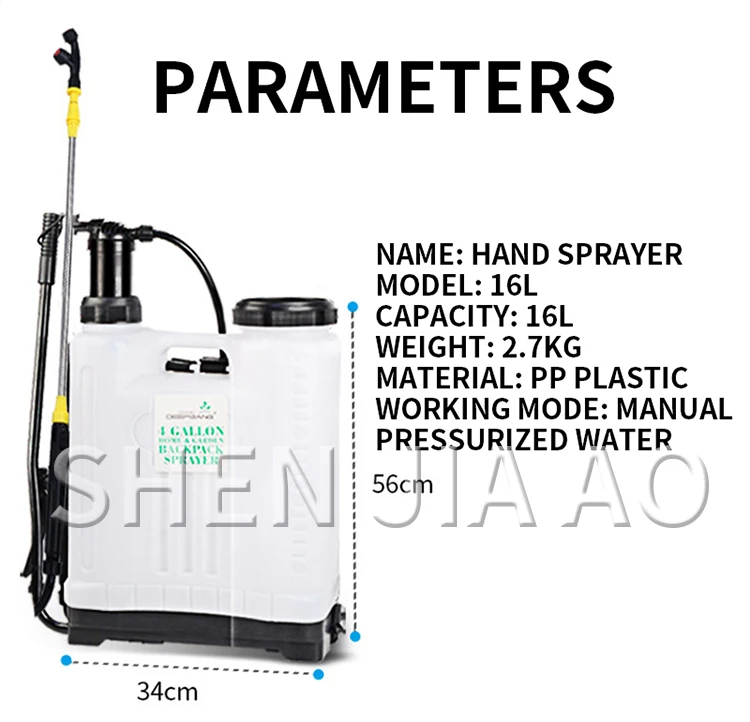 Наименование: ручной опрыскиватель Модель: 16 л Емкость: 16 л Вес: 2,7 кг Материал: PP пластик Режим работы: ручная вода под давлением