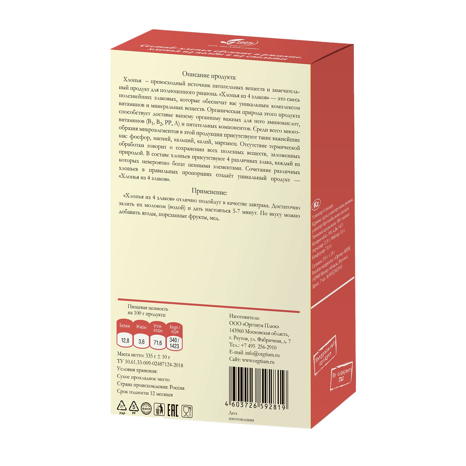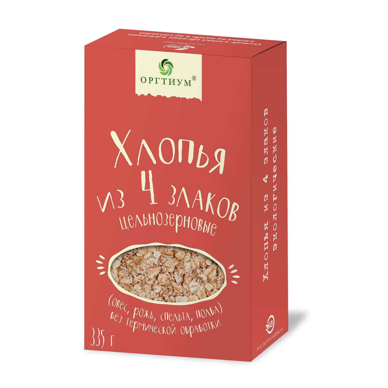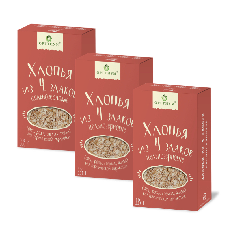Хлопья 4 злака цельнозерновые без термической обработки Оргтиум, 3 шт по 335 гр