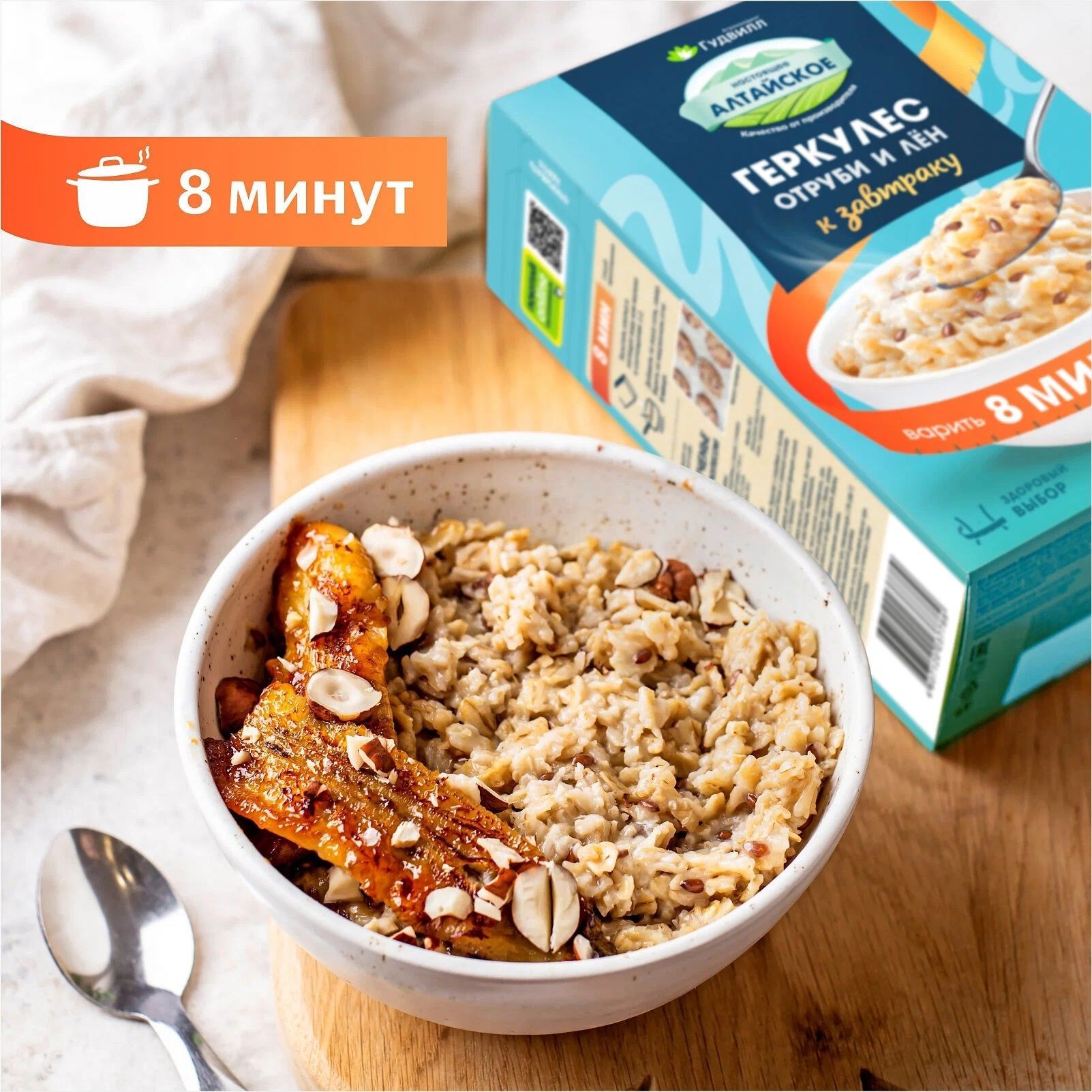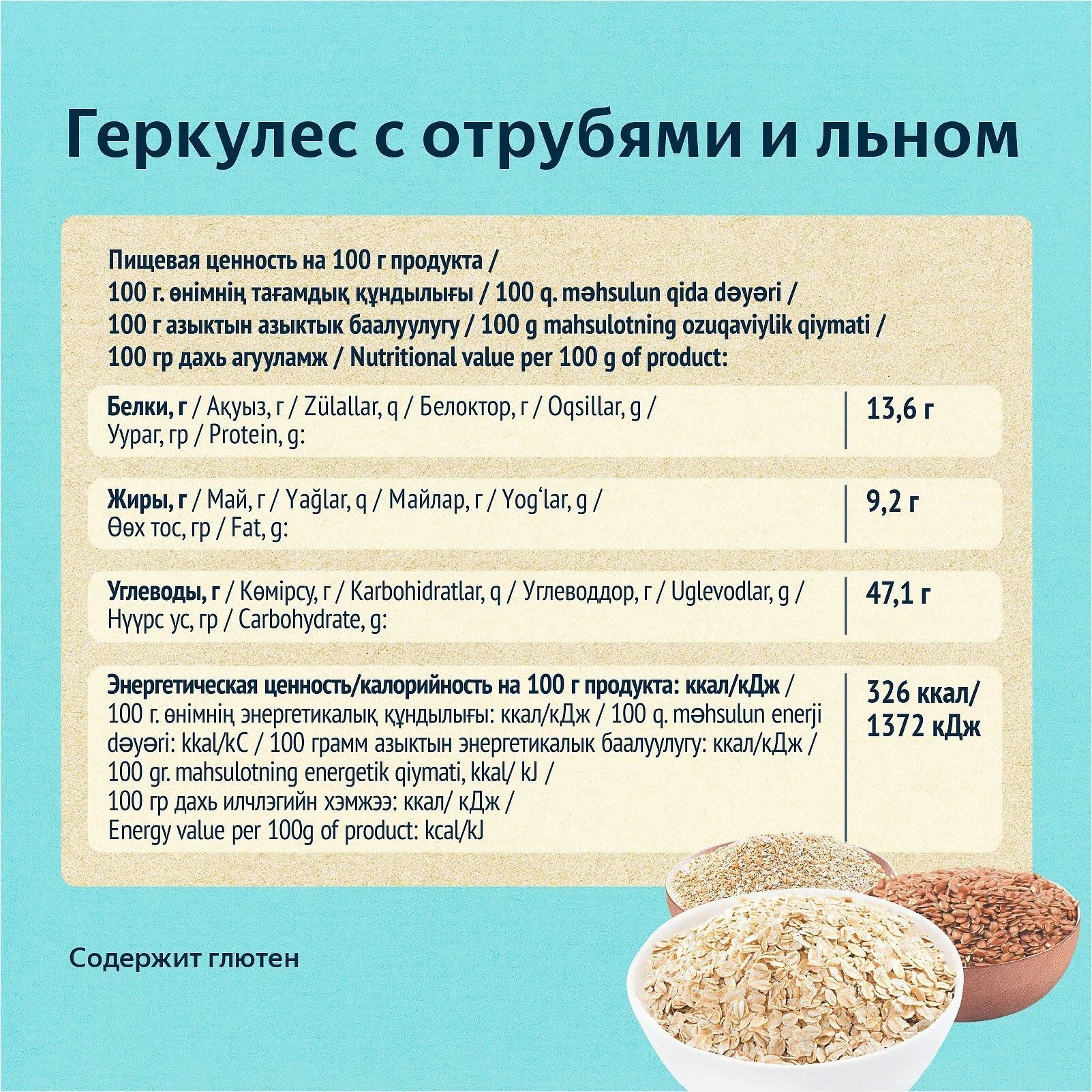 Состав: хлопья овсяные Геркулес «Экстра» 77,5%, отруби овсяные пищевые 15%, семена льна 7.5%.