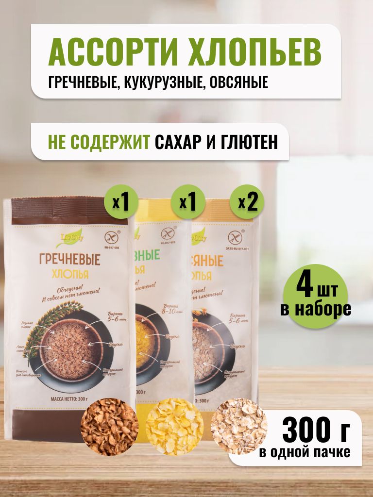 Хлопья кукурузные 1шт, гречневые 1шт и овсяные 2шт LivCity без глютена/ Правильная и полезная еда/ Безмолочные каши