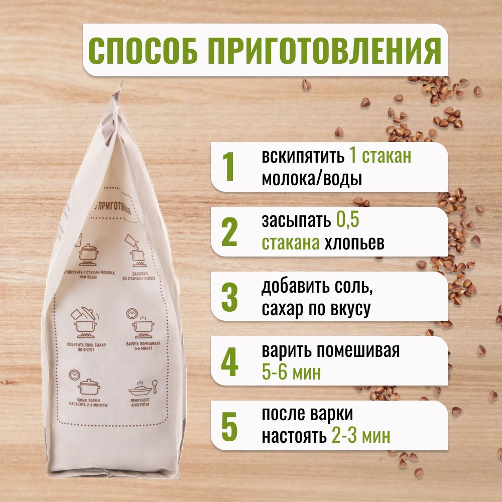 Для приготовление гречневых хлопьев необходимо: вскипятить 1 стакан молока или воды, засыпать 0,5 стакана хлопьев, добавить соль, сахар по вкусу, варить помешивая 5-6 минут. После варки настоять 2-3 минуты.