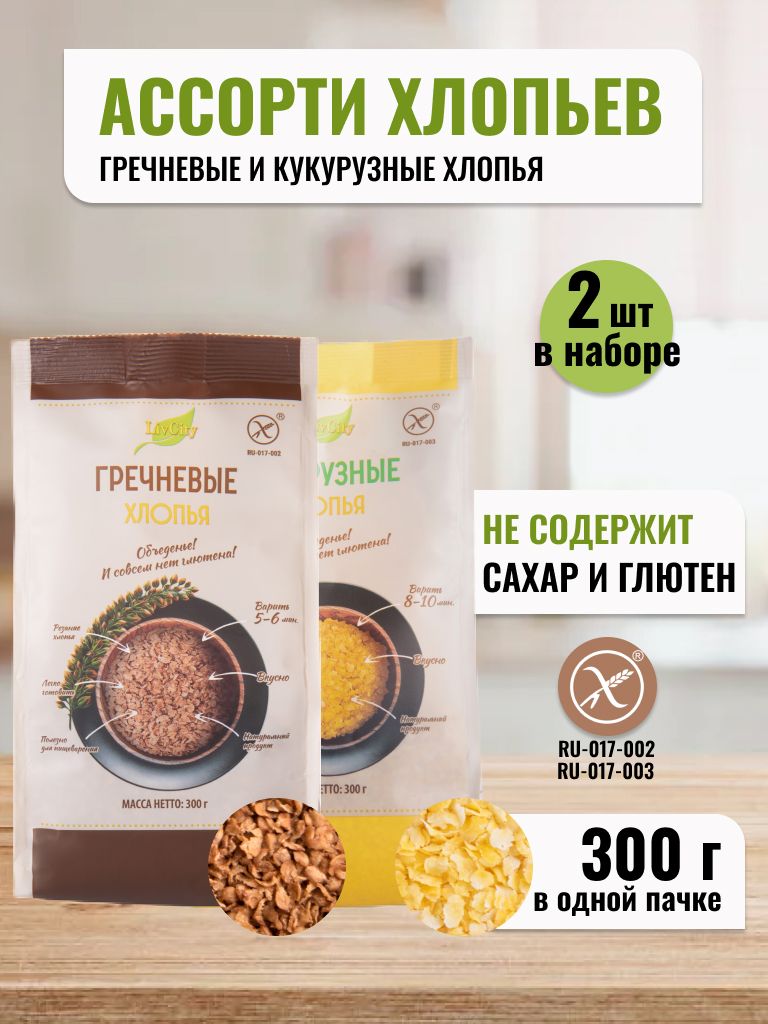 Хлопья кукурузные и гречневые LivCity без глютена, без сахара, для завтрака/ Безмолочные каши 2шт. по 300гр.