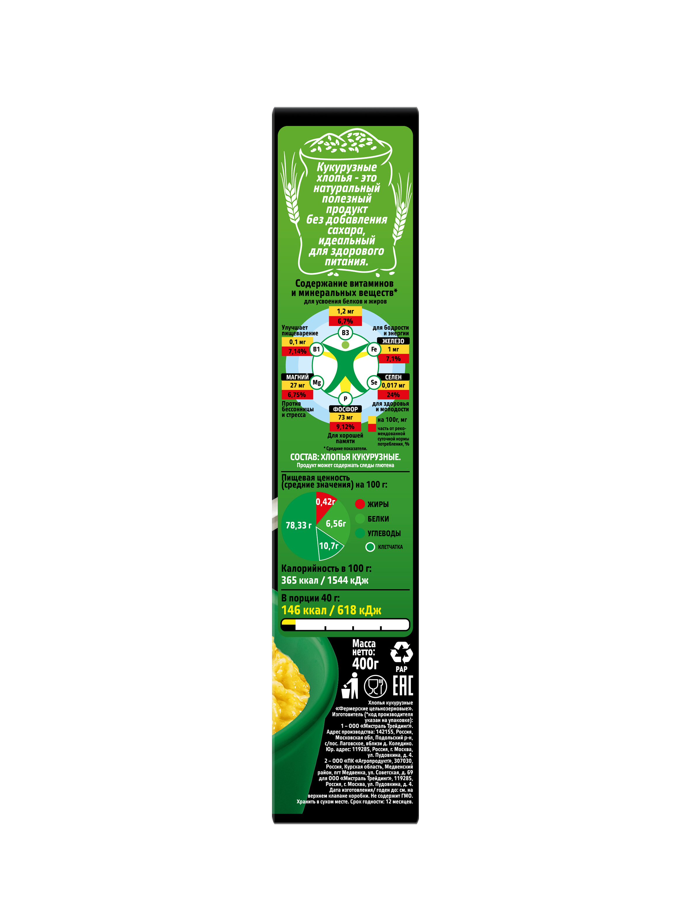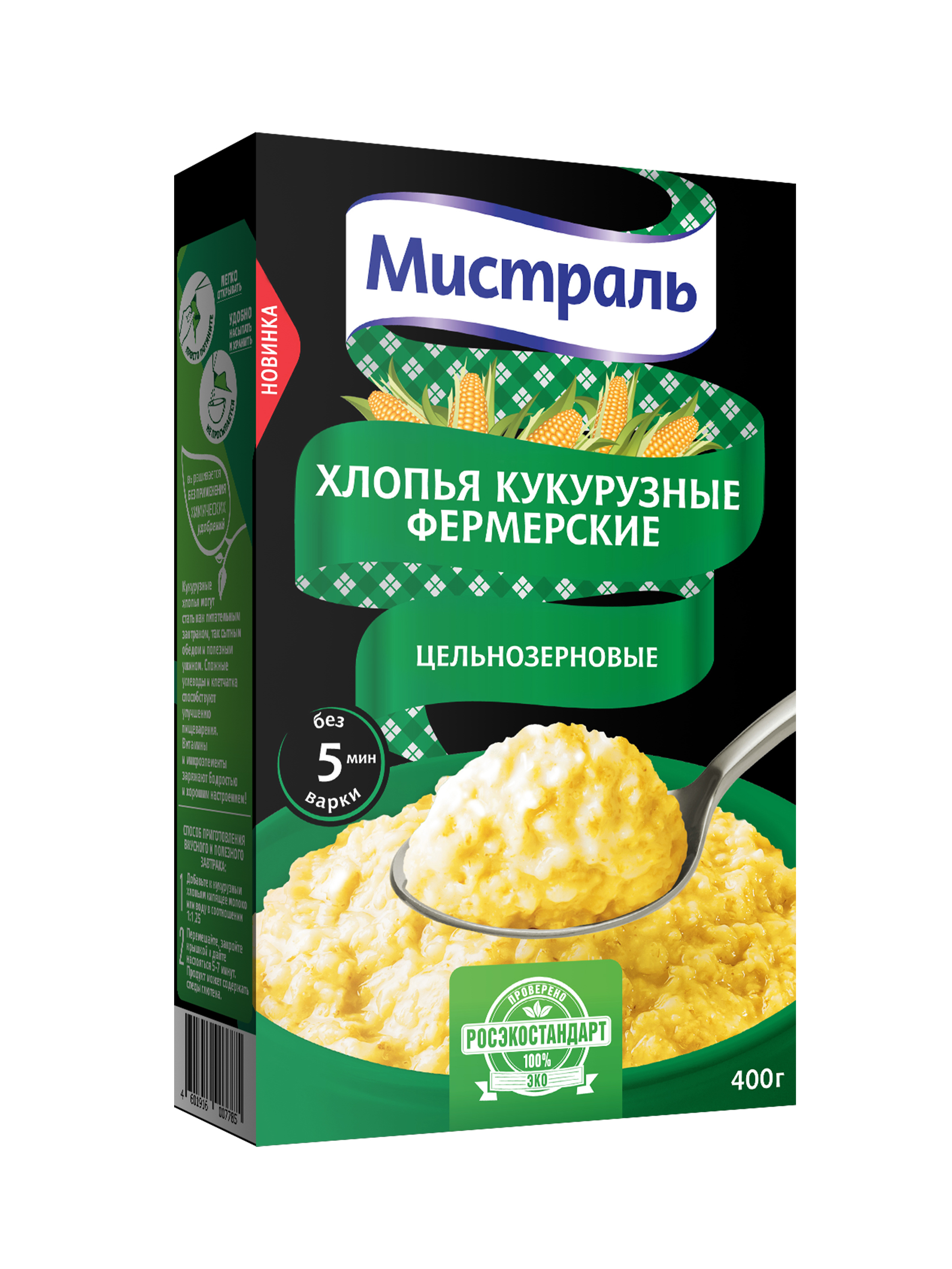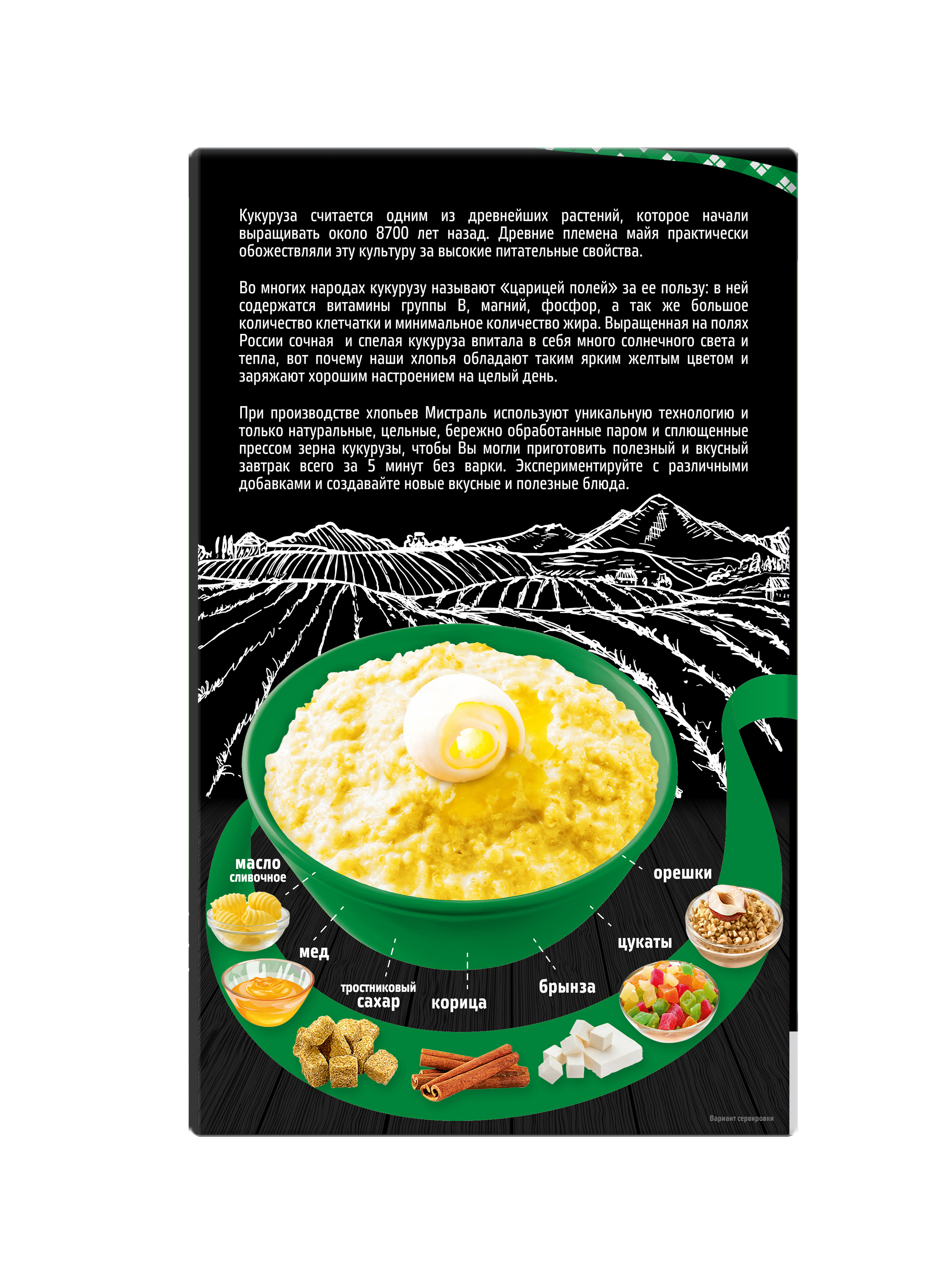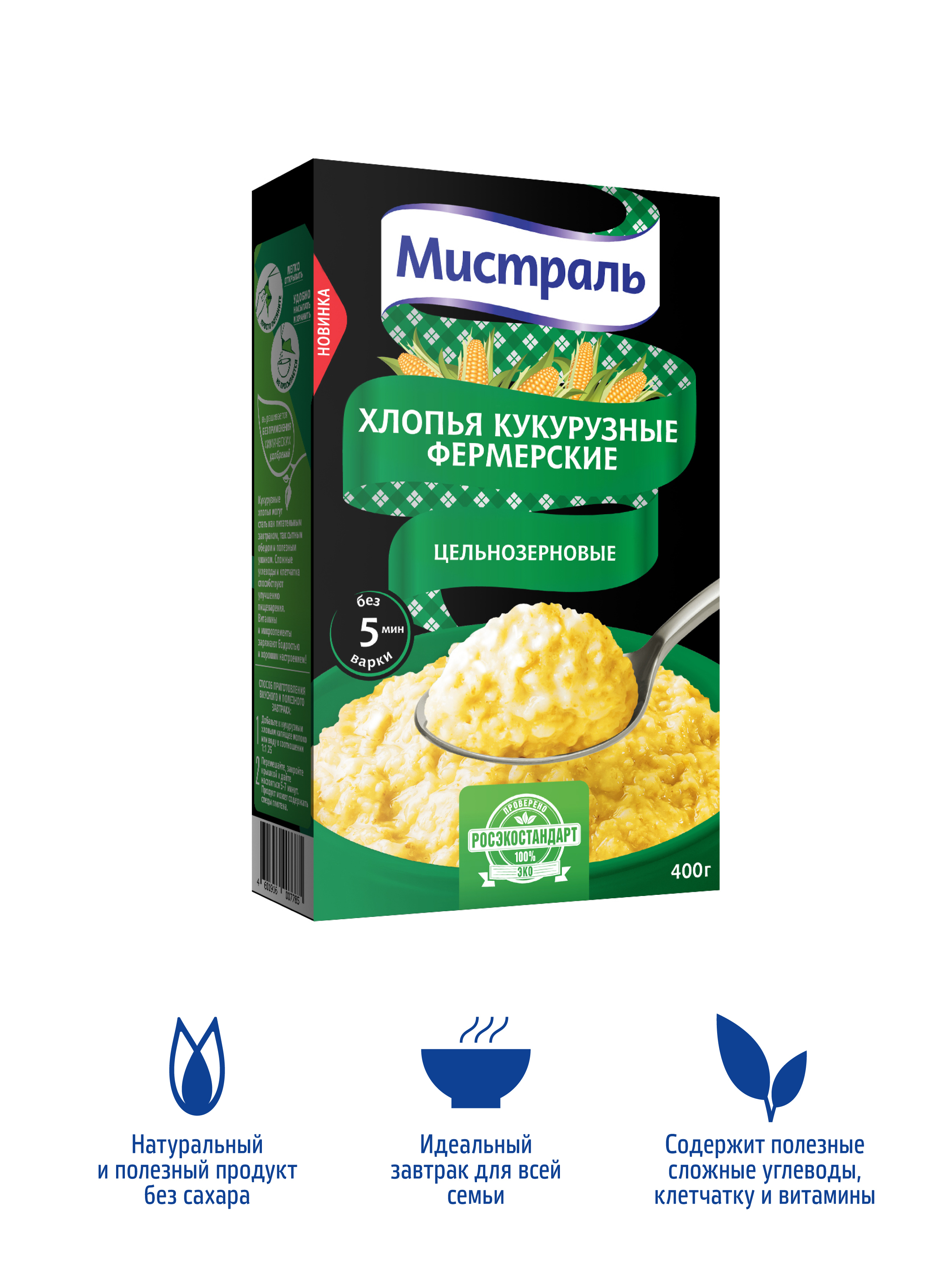 Описание: Выращенная на экологически чистых полях России, сочная и спелая кукуруза впитала в себя много солнечного света и тепла, вот почему наши хлопья обладают таким ярким желтым цветом и заряжают хорошим настроением на целый день! Кукурузные хлопья от Мистраль — это полезный и вкусный завтрак всего за 5 минут без варки.