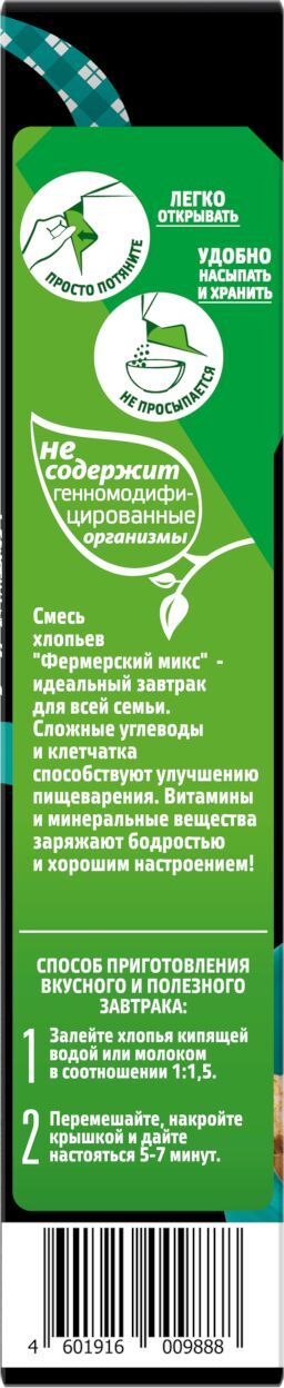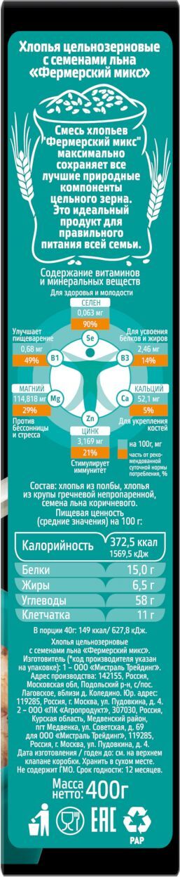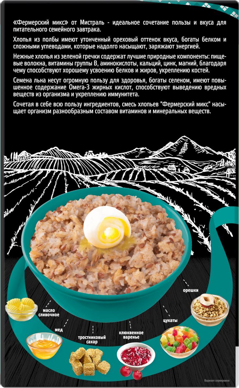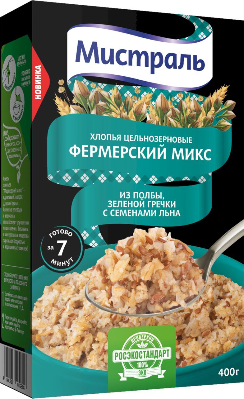 Описание: «Фермерский микс» от Мистраль — идеальное сочетание пользы и вкуса для полезного и питательного семейного завтрака. Хлопья из полбы имеют утонченный ореховый оттенок вкуса, богаты белком и сложными углеводами, которые надолго насыщают, заряжают энергией. Нежные хлопья из зеленой гречки содержат лучшие природные компоненты: пищевые волокна, витамины группы В, аминокислоты, калий, цинк, магний, благодаря чему способствуют хорошему усвоению белков и жиров, укреплению костей. Семена льна несут огромную пользу для здоровья, богаты селеном, имеют повышенное содержание Омега-3 жирных кислот, способствуют выведению вредных веществ из организма и укреплению иммунитета. Сочетая в себе всю пользу ингредиентов, смесь хлопьев «Фермерский микс» насыщает организм разнообразным составом витаминов и минеральных веществ.