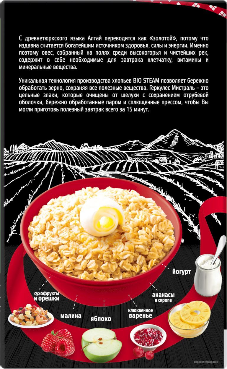 Описание: С древнетюркского языка Алтай переводится как «золотой», потому что издавна считается богатейшим источником здоровья, силы и энергии. Именно поэтому овес, собранный на экологически чистых полях среди высокогорья и чистейших рек, содержит в себе необходимые для завтрака клетчатку, витамины и минералы. Геркулес Фермерский от Мистраль — это полезный завтрак всего за 15 минут.