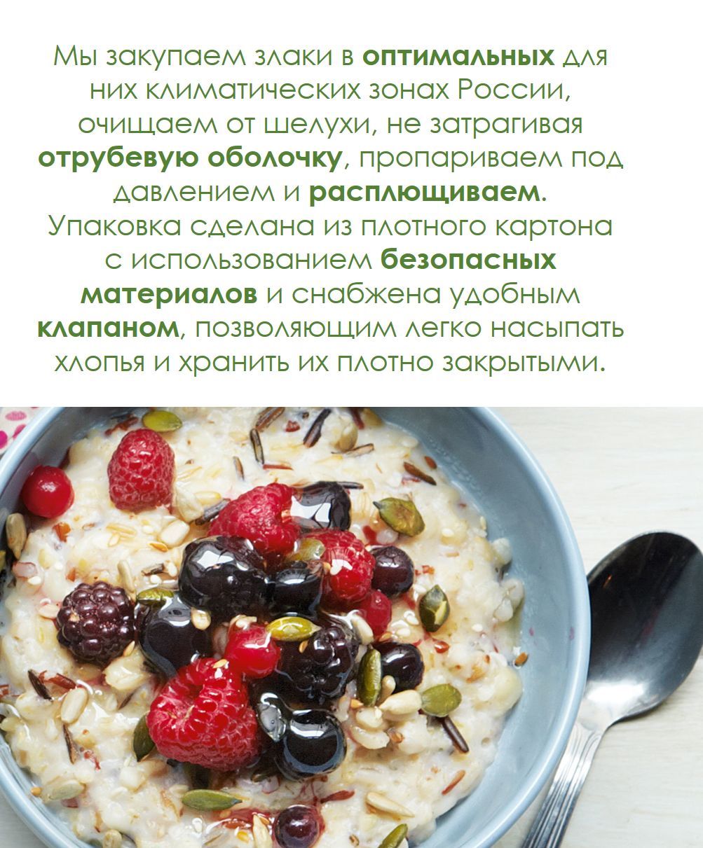 Описание: Секрет натуральности хлопьев Мистраль прост: наши хлопья — это то же зерно, только плоское. Мы закупаем злаки в оптимальных для них климатических зонах России, очищаем от шелухи, не затрагивая отрубевую оболочку, пропариваем под давлением и расплющиваем. Зерно остается цельным и сохраняет свои природные свойства. Теперь можно приготовить полезный горячий завтрак, потратив лишь несколько минут.