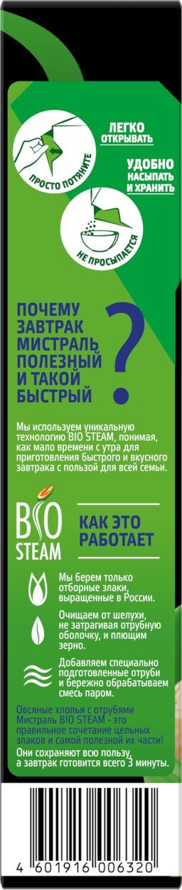 Описание: Секрет натуральности хлопьев Мистраль прост: наши хлопья — это то же зерно, только плоское. Мы закупаем злаки в оптимальных для них климатических зонах России, очищаем от шелухи, не затрагивая отрубевую оболочку, пропариваем под давлением, мелко рубим и расплющиваем. Смешиваем с отрубями — натуральным источником витаминов и клетчатки. Теперь можно приготовить полезный горячий завтрак, потратив лишь несколько минут.