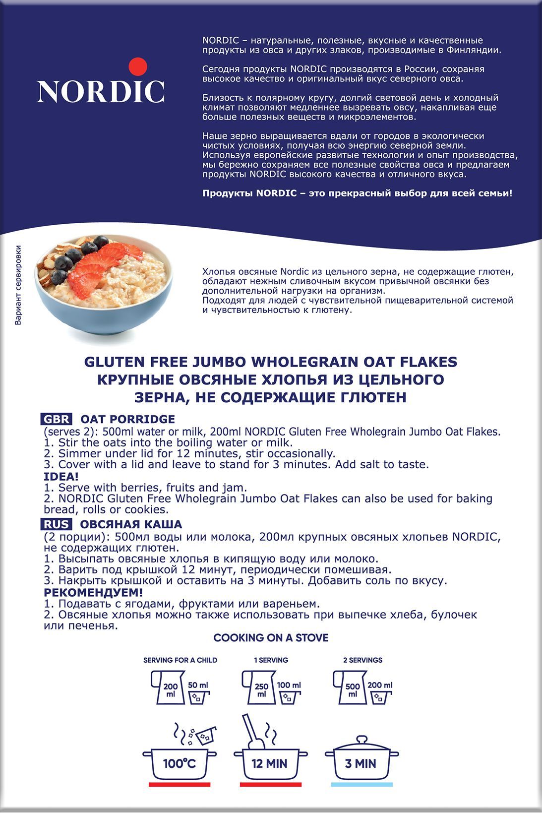 Описание: Овсяные хлопья для каши произведены из отборного ЧИСТОГО зерна, выращенного в Финляндии. «Чистый» овес выращивается с использованием специальных семян, соответствующих требованиям чистого сорта, перерабатывается и фасуется на предприятиях, которые не перерабатывают другие виды зерновых культур или на отдельной линии. Чистота сырья и продукции дополнительно проверяется c помощью анализов и сертифицируется. Содержание глютена менее 20мг/кг (фактически менее 5мг/кг). Подходит для людей с чувствительной пищеварительной системой.