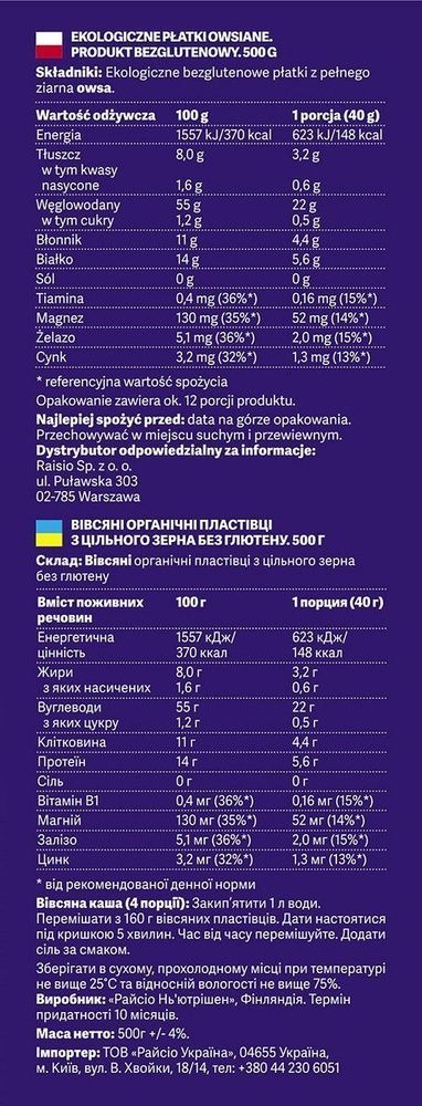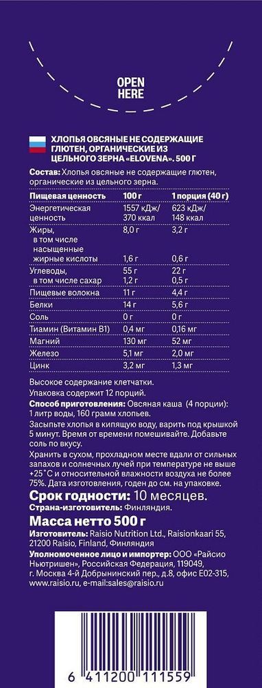 По сравнению с классическими Jumbo Oats, органические хлопья имеют более тонкую структуру, поэтому из них всего за пять минут можно приготовить кашу с более мягкой текстурой и практически воздушной консистенцией. При этом в продукте сохранено максимум пользы, так что по своим питательным свойствам этот вариант ничем не отличается от хлопьев долгой варки. Овёс, из которого произведены хлопья, выращен в соответствии со строгими правилами финского органического сельского хозяйства, он словно вобрал в себя всю энергию северной природы. Продукт богат клетчаткой, тиамином, магнием, железом, цинком. В то же время хлопья обладают нежным нейтральным вкусом, поэтому в качестве источника клетчатки их можно добавлять в другие блюда — омлеты, смузи, выпечку.