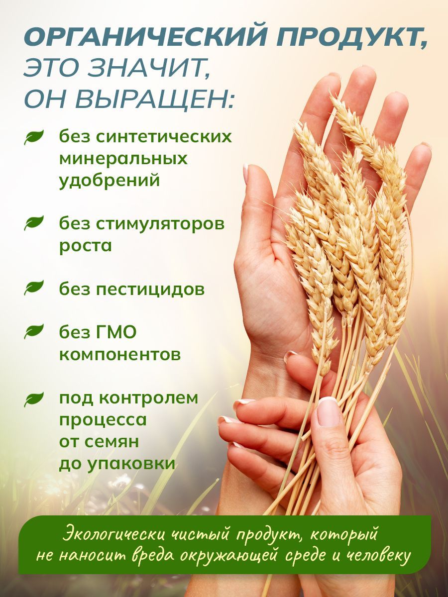 Продукт считается органическим, если он выращен без синтетических минеральных удобрений, без стимуляторов роста, без пестицидов, без ГМО компонентов. Процесс контролируется на всех этапах - от семян до упаковки. Почему мы так любим хлопья на завтрак? Это вкусно, быстро и просто! Вот почему хлопья – привычный продукт для многих людей. Органические хлопья быстрого приготовления - полезны для здоровья. В овсяное зерно природа заложила необходимые витамины и микроэлементы для полноценного рациона, отличного самочувствия и заряда энергии на весь день.Овсяная каша - лёгкий и дружелюбный для пищеварения продукт.Овес в виде хлопьев легко и в полной мере усваивается, питая организм и снабжая его ценными витаминами и минералами. Откройте для себя по-настоящему полезный завтрак с органическими хлопьямиХлопья из органического овса – отличное начало дня.Такой завтрак поможет надолго сохранить чувство сытости, а его регулярное употребление не только наладит пищеварение, но и настроит организм на правильный образ жизни. Способ приготовления: в кипящую воду добавить хлопья в соотношении 5:1 (на 50 г хлопьев 250 мл воды). После повторного закипания варить на умеренном огне 5-7 минут. Готовые хлопья имеют приятную текстуру, насыщенный вкус и аромат. По вкусу в готовое блюдо можно добавить масло, молоко, мед, сахар, орехи, ягоды, фрукты,