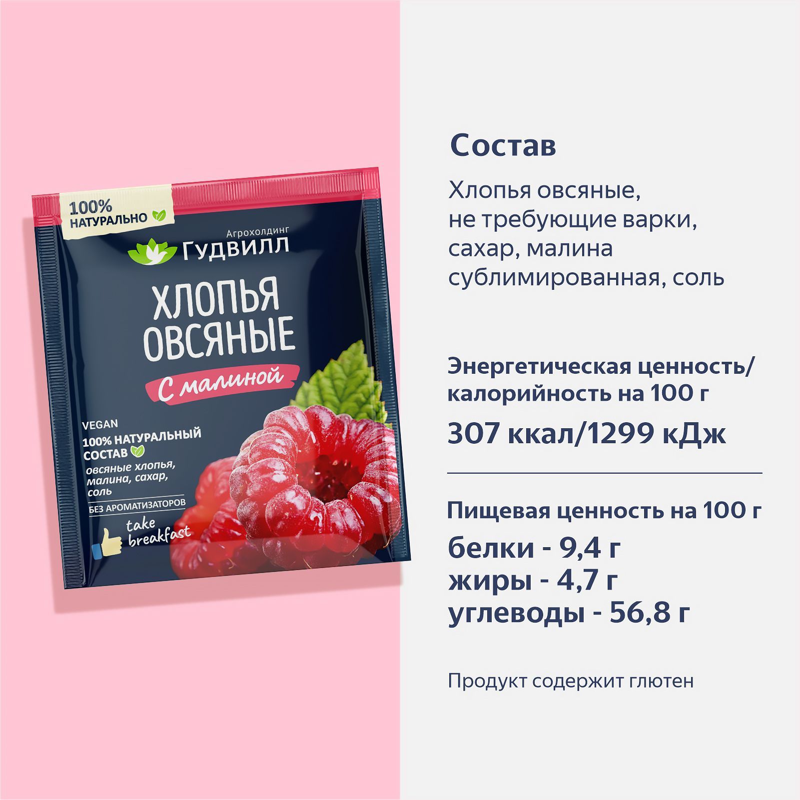 Хлопья овсяные, не требующие варки, сахар, малина, соль. Не содержит ГМО.