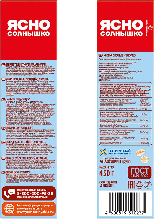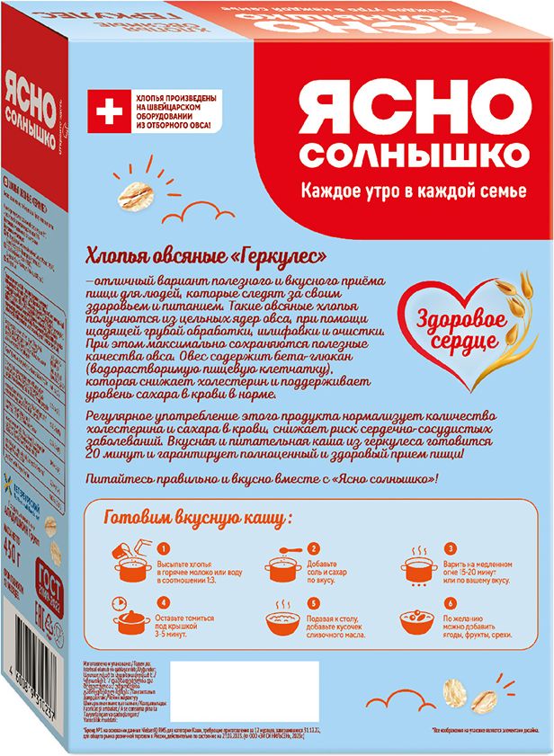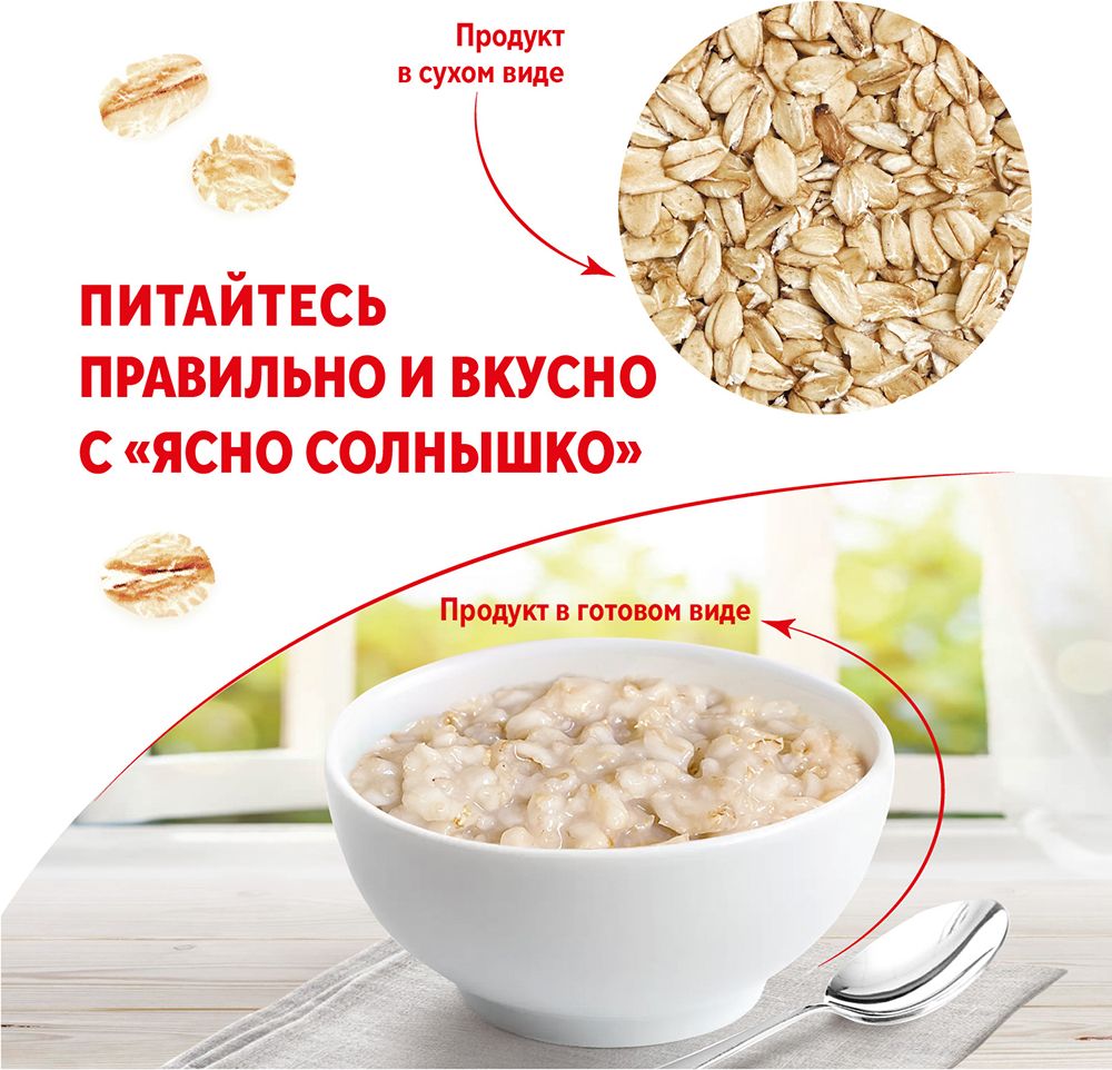 Описание: Геркулес ТМ «Ясно Солнышко» производится только из натуральных зерен овса собственного производства и проходит минимальную механическую обработку. Состав продукта идеально подойдет для тех, кто следит за своим питанием и предпочитает здоровый рацион! Для приготовления геркулесовой каши вам потребуется высыпать сухой продукт в горячее молоко или воду в соотношении 1:3, добавить соль, сахар по вкусу и размешать. Геркулес следует варить на медленном огне 12-15 минут и дать немного настояться после варки (3-5 мин). Порадуйте себя и близких вкусными и здоровыми завтраками от ТМ «Ясно Солнышко»!