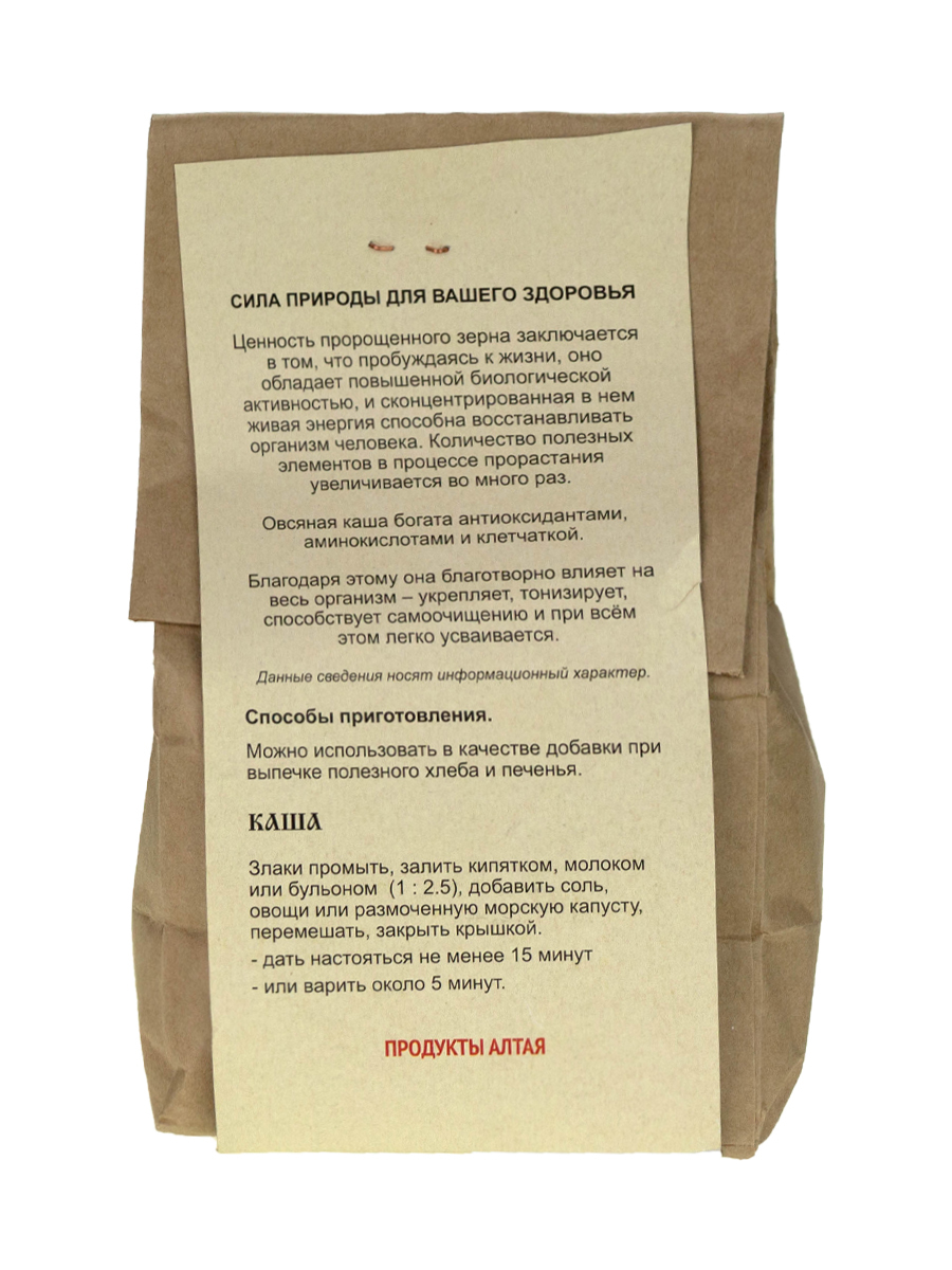 Злаки промыть, залить кипятком, молоком или бульоном (1 : 2.5), добавить соль, овощи или размоченную морскую капусту, перемешать, закрыть крышкой.- дать настояться не менее 15 минут- или варить около 5 минутСостав: Зерно овса голозерного пророщенное, сушёное, плющеное.