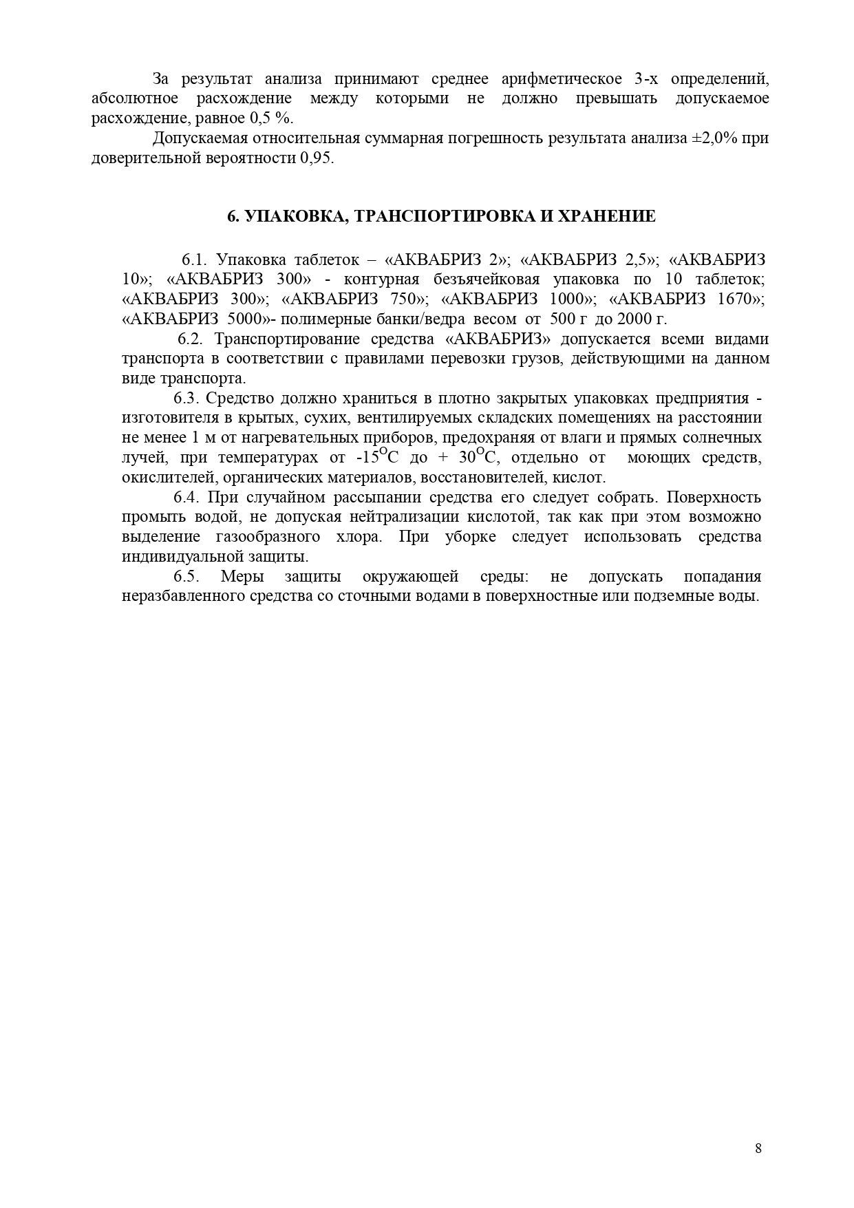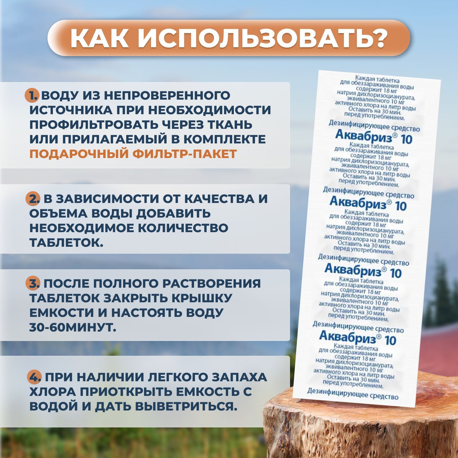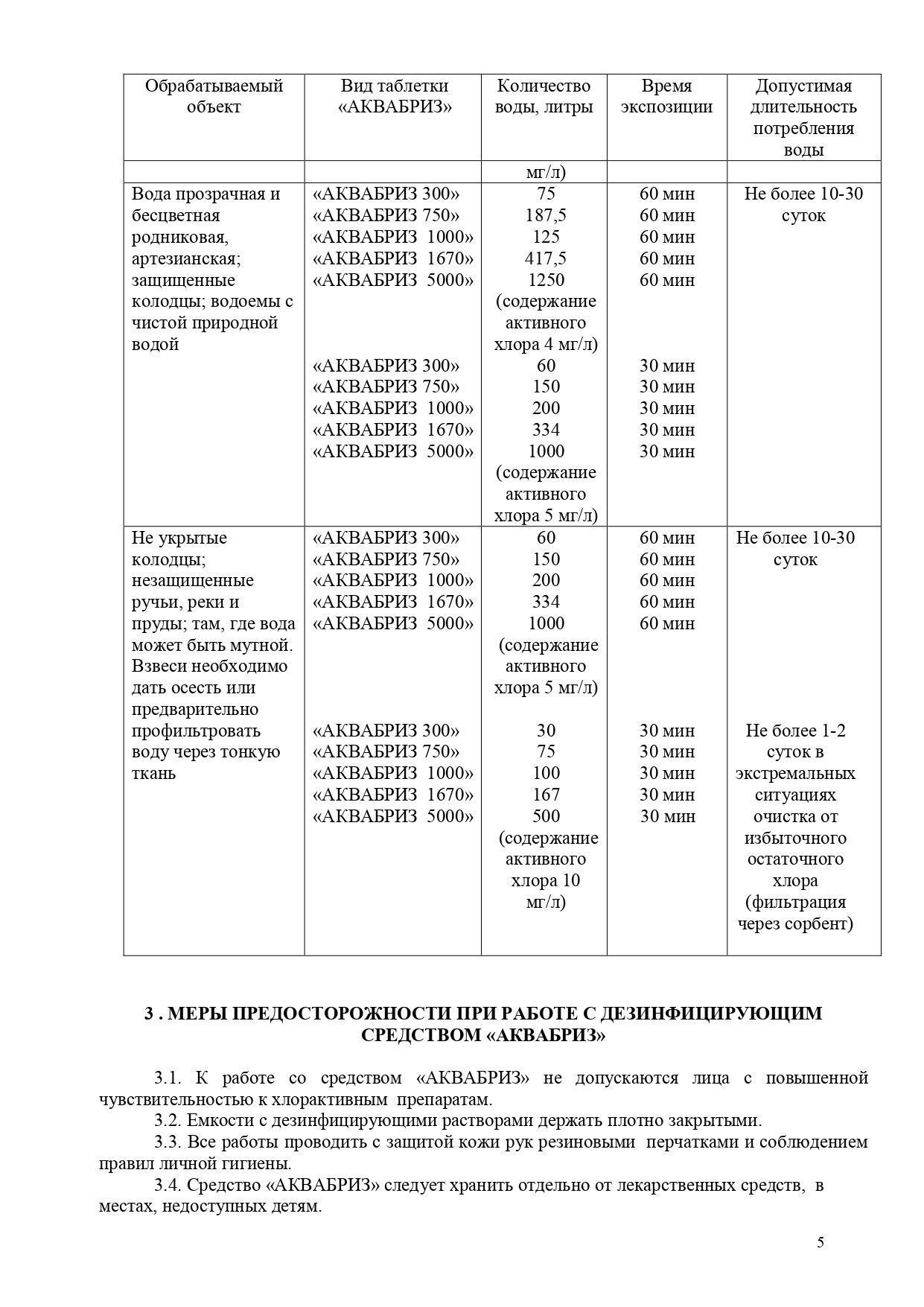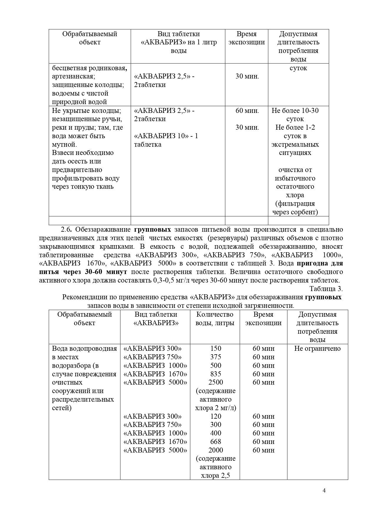 Рекомендуется использовать 1 таблетку Аквабриз 10 мг на 1- 5 литров воды в зависимости от степени загрязнения источника.