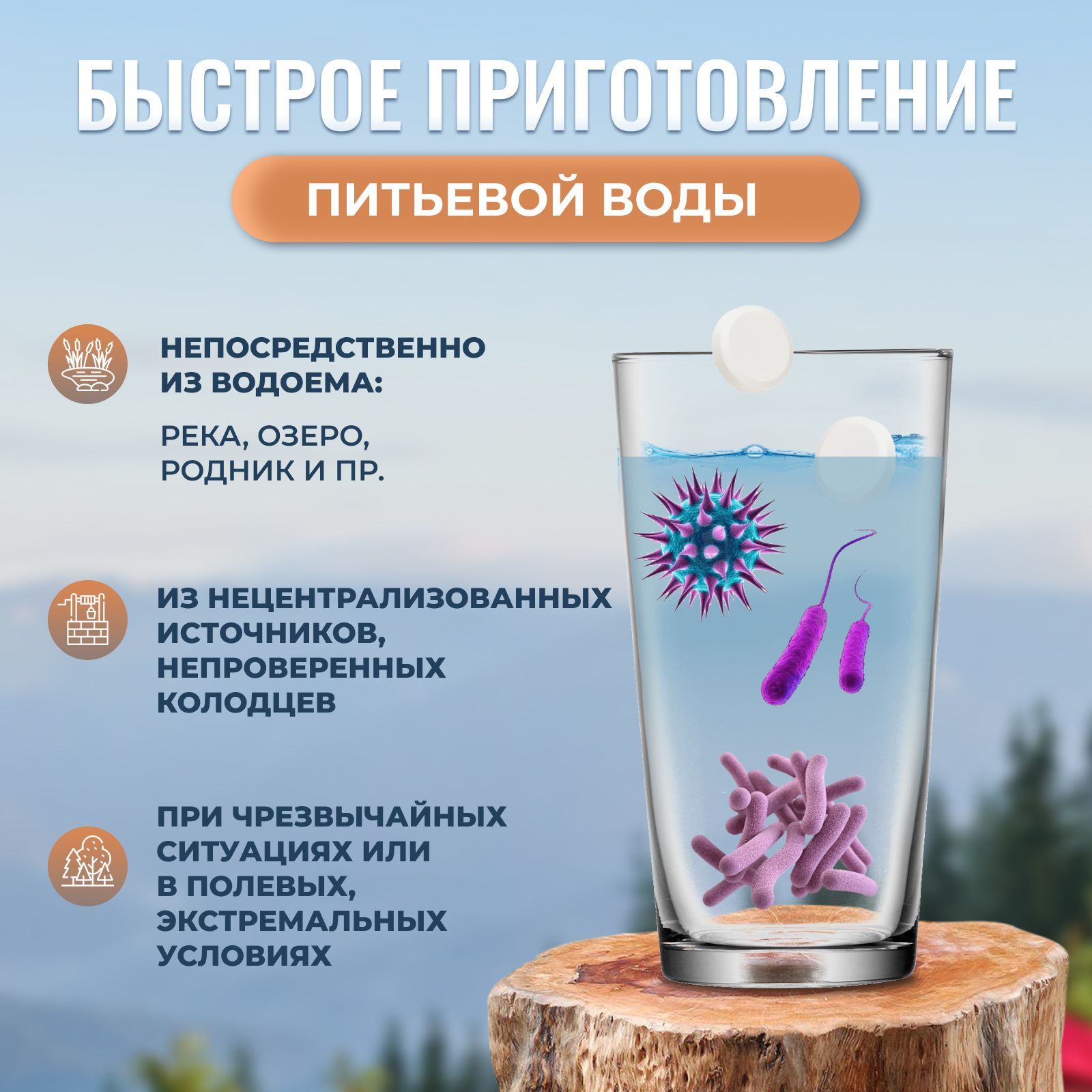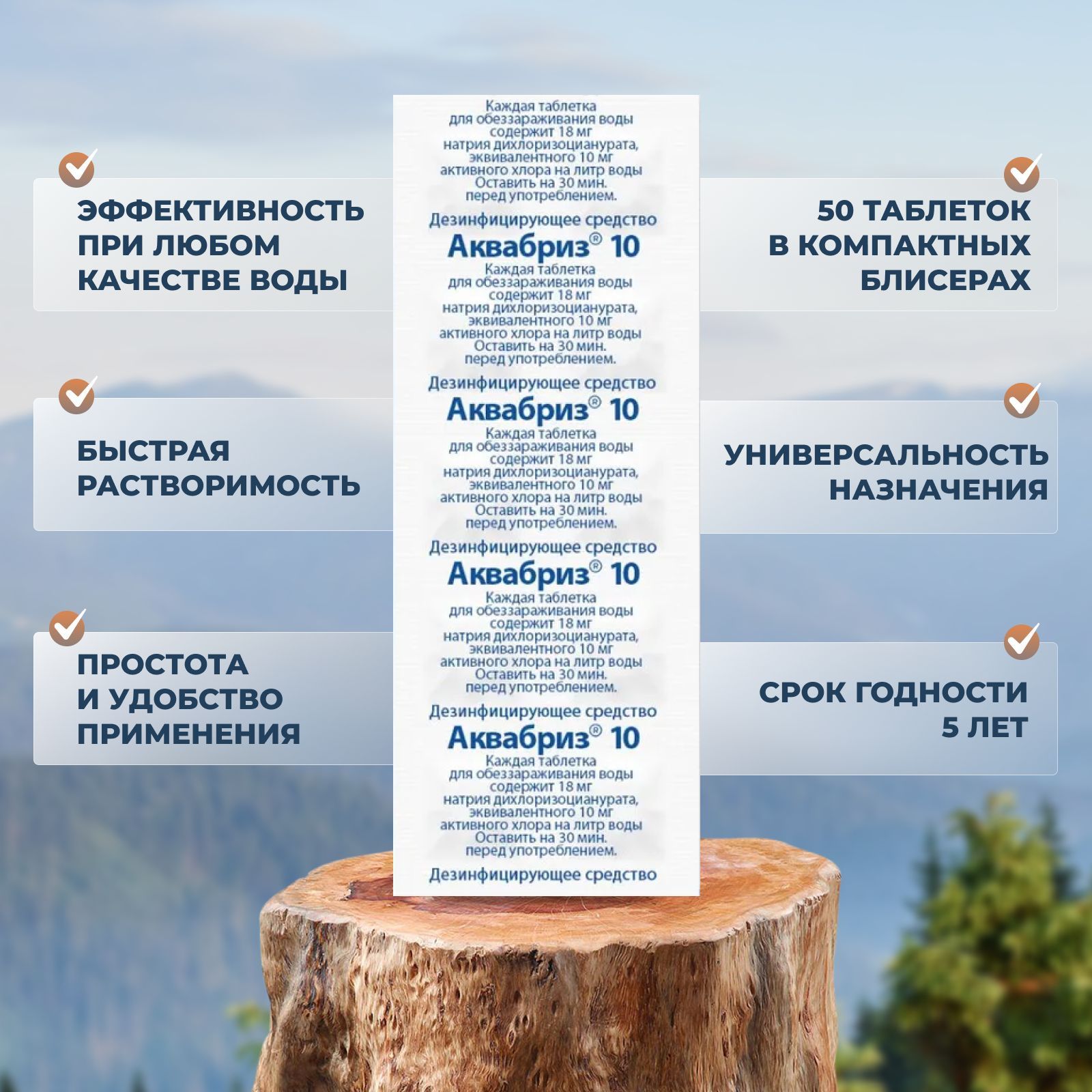 Таблетки для обеззараживания воды просты в использовании и имеют длительный срок хранения до 5 лет, что делает их идеальными как для путешествий, так и для домашнего использования.