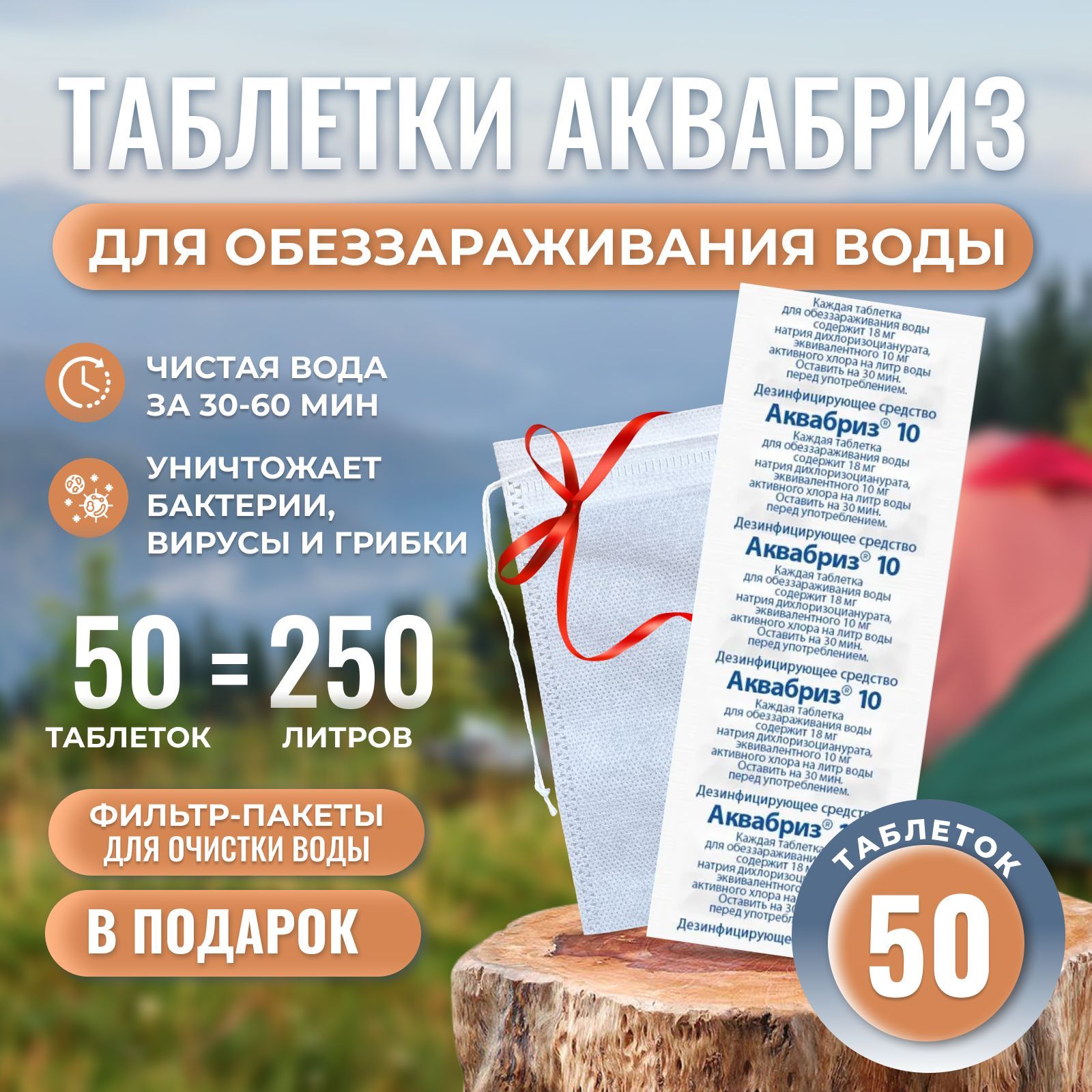 Хлорные таблетки для обеззараживания воды Аквабриз 10 мг-50шт. Дезинфицирующее средство + фильтр для воды
