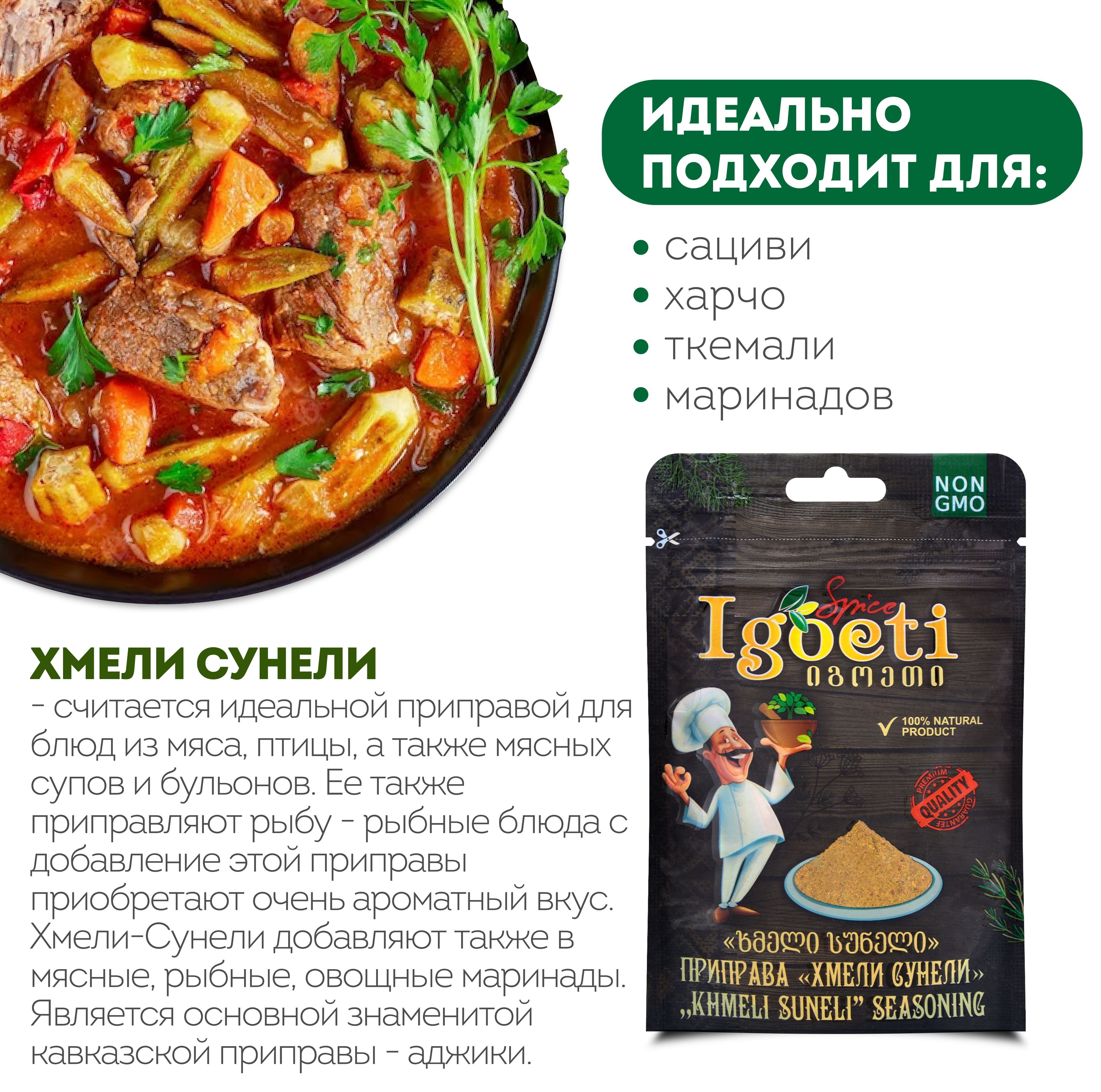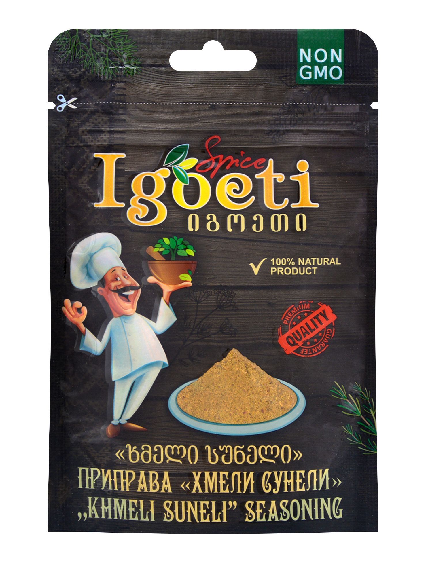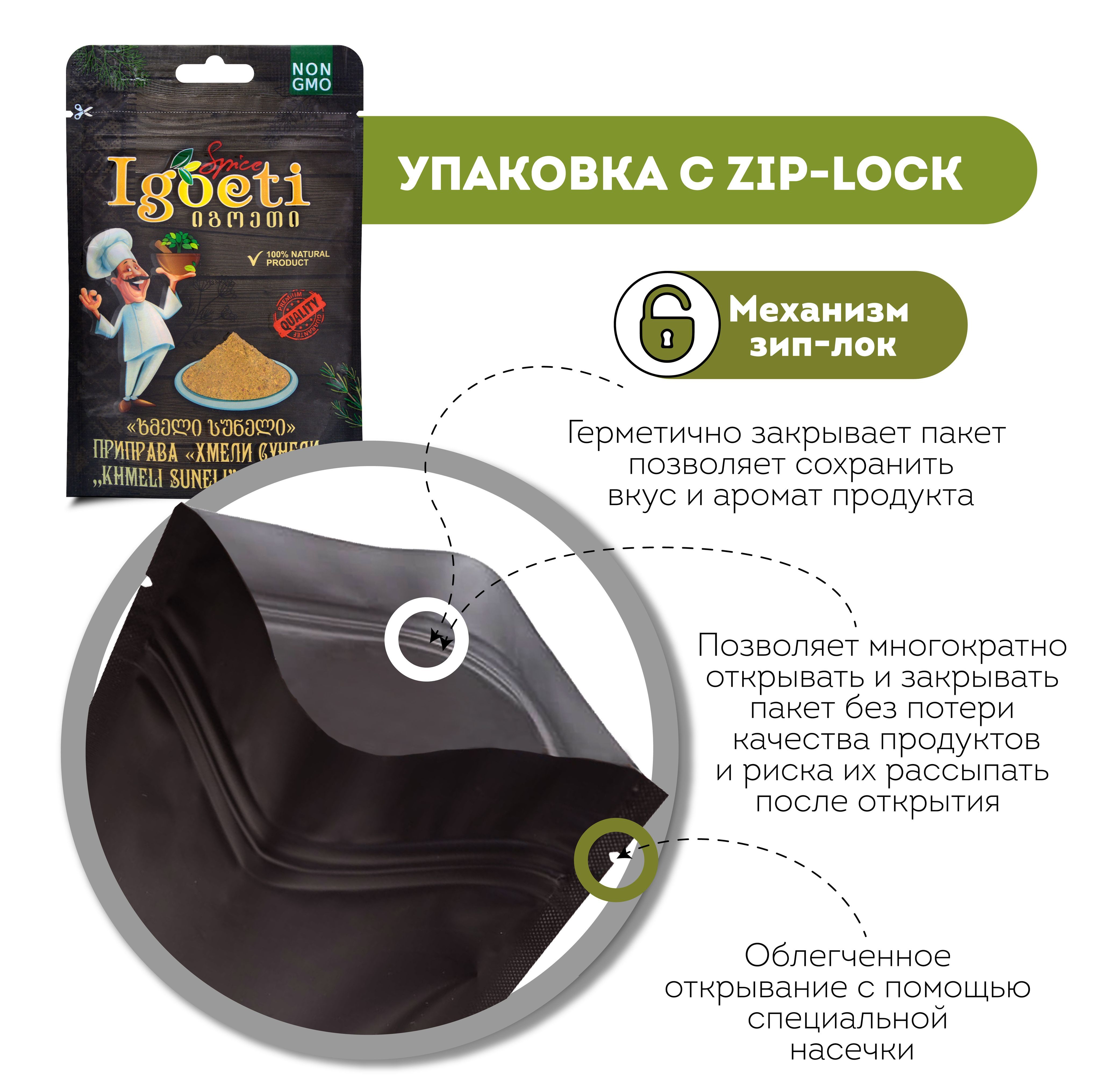 Хмели-сунели - традиционная грузинская пряная смесь. Применяется в грузинских национальных блюдах и соусах: сациви, харчо, лобиани, тушеной говядина по-грузински, ткемали, аджике и др.Упаковка с удобным механизмом открытия/закрытия зип-лок.