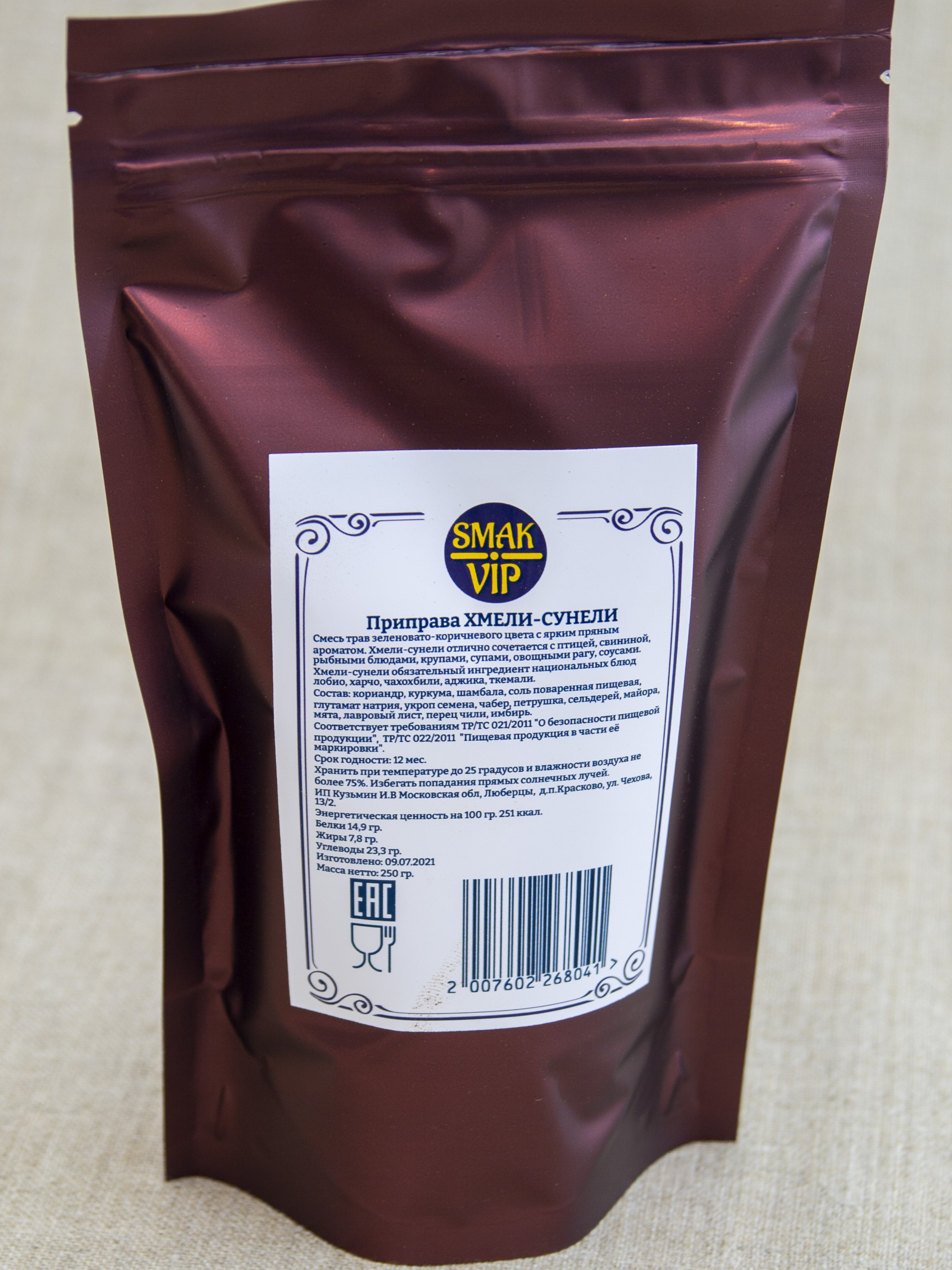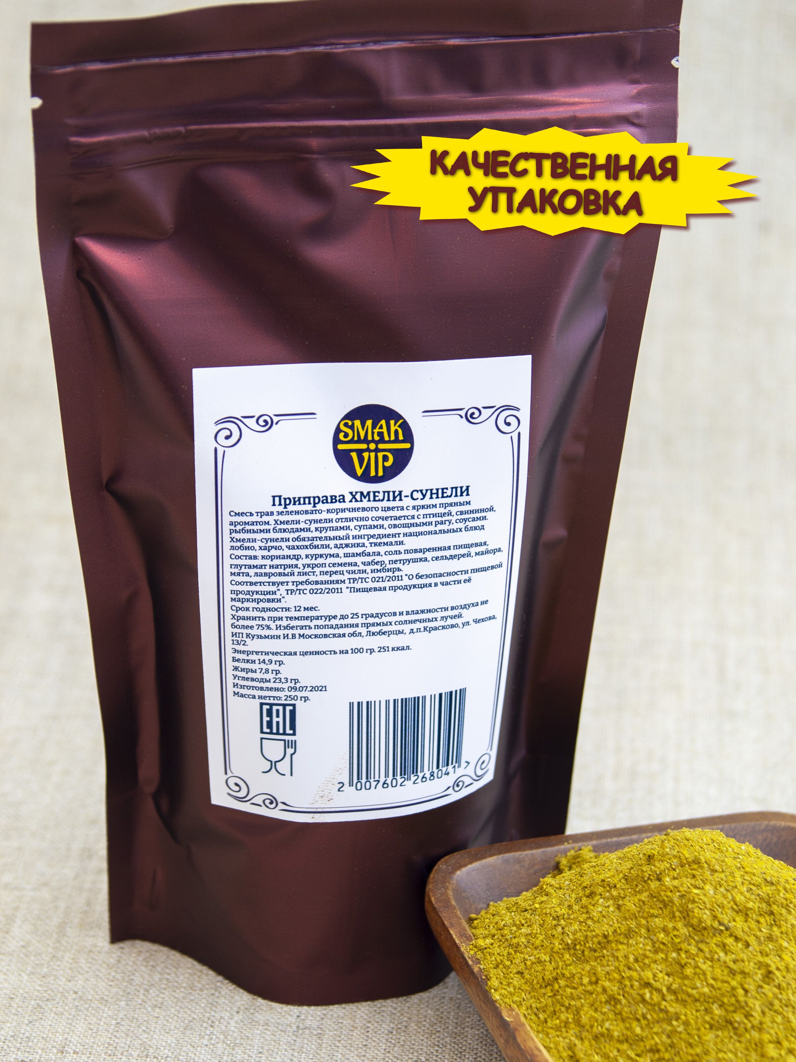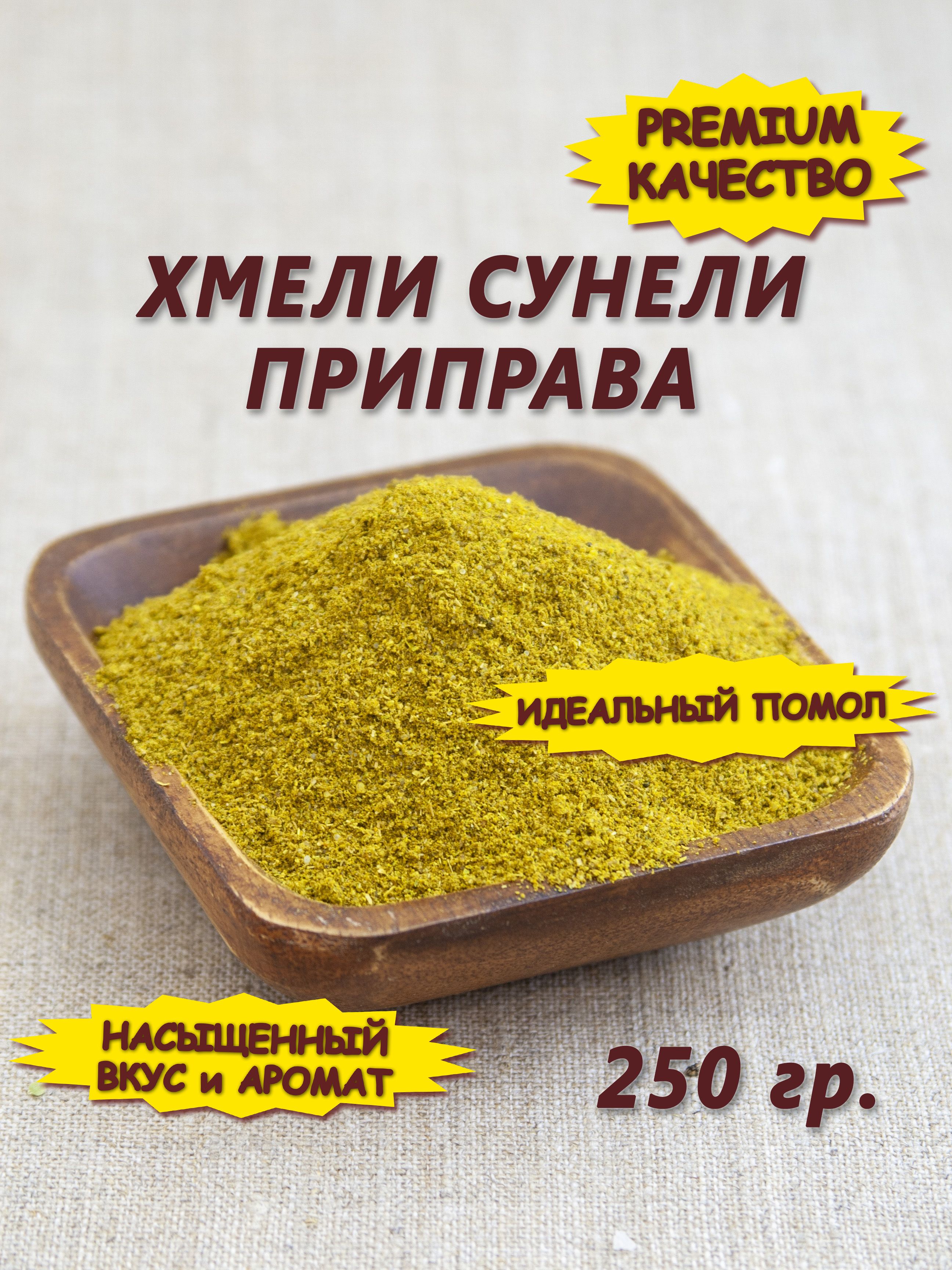 Описание: Хмели-сунели - известная смесь специй и трав с ярко выраженным ореховым пряным ароматом. В приправе хмели-сунели так замечательно соединяются вкусовые отголоски входящих в неё специй, что она значительно улучшает вкус мясных и рыбных блюд, салатов, овощных рагу, супов, соусов, каш и макарон. Эта приправа обязательный компонент национальных блюд чахохбили, сациви, харчо, лобио, ткемали. Благодаря содержанию витаминов, минералов, эфирных масел, пищевых волокон, антиоксидантов, флавоноидов, приправа хмели-сунели благотворно воздействует на организм. Хмели сунели обладает бактерицидным, антиоксидантным, спазмолитическим, успокаивающим действием. Незаменимая приправа на вашей кухне!