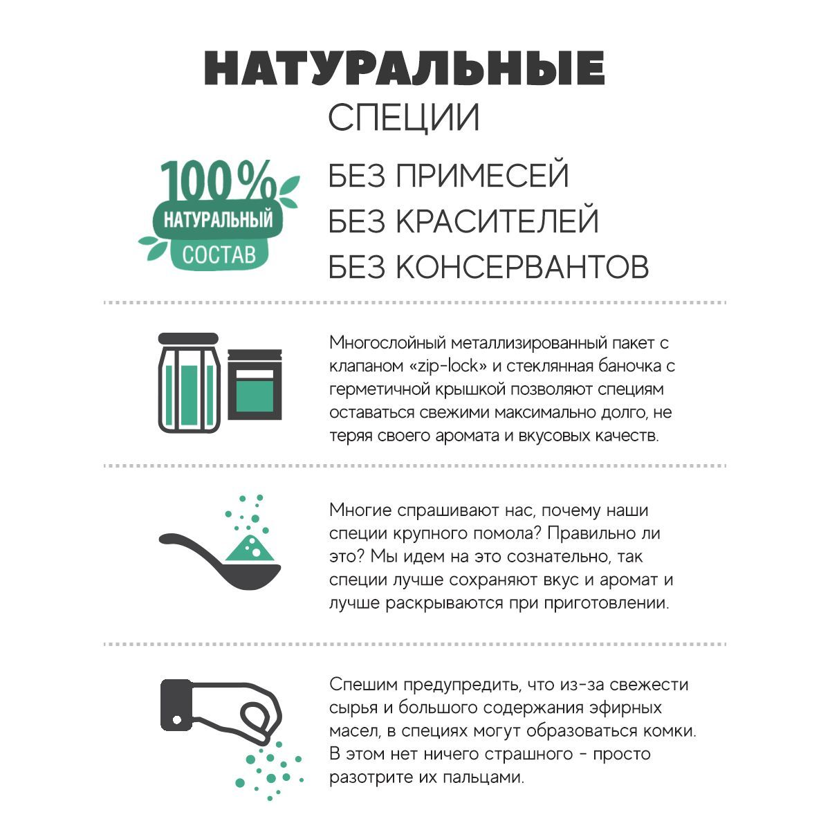Описание: Текстовое описание изображенияДРУЗЬЯ, НЕ БОЙТЕСЬ СПЕЦИЙЧасто единожды использованные банки задвигают в мрачные глубины кухонного шкафа, где они стоят нетронутыми долгие годы. Так быть не должно! Пряности не только улучшают естественные ароматы блюда, но и по-новому раскрывают гастрономические особенности знакомых продуктов. Готовить без специй все равно что сочинять симфонию без нот. Не бойтесь экспериментировать и вы поймете, какое богатство вкусов могут предложить вам пряности!Текст при отключенной в браузере загрузке изображенийИСПОЛЬЗУЕМ ТОЛЬКО НАТУРАЛЬНЫЕ СПЕЦИИ НАИВЫСШЕГО КАЧЕСТВА БЕЗ ГМО, "ПУСТЫШЕК" И КОНСЕРВАНТОВТекст при отключенной в браузере загрузке изображенийМЫ ПРЕДЛАГАЕМ ВАМ ТОВАР, В КОТОРОМ УВЕРЕНЫ НА ВСЕ 100%. МЫ ЕДМИ ИХ САМИ, ДАРИМ ДРУЗЬЯМ И РОДСТВЕННИКАМТекст при отключенной в браузере загрузке изображенийВСЕ НАШИ СПЕЦИИ СВЕЖЕМОЛОТЫЕ, ЧТО ДЕЛАЕТ ИХ НЕОБЫЧАЙНО АРОМАТНЫМИ, А БЛЮДА С НИМИ НЕЗАБЫВАЕМЫМИТекст при отключенной в браузере загрузке изображенийКАЖДОЙ СПЕЦИИ МЫ ПЕРСОНАЛЬНО ПОДБИРАЕМ ПОМОЛ ДЛЯ НАИЛУЧШЕГО РАСКРЫТИЯ ЕЁ ВКУСОВЫХ КАЧЕСТВ