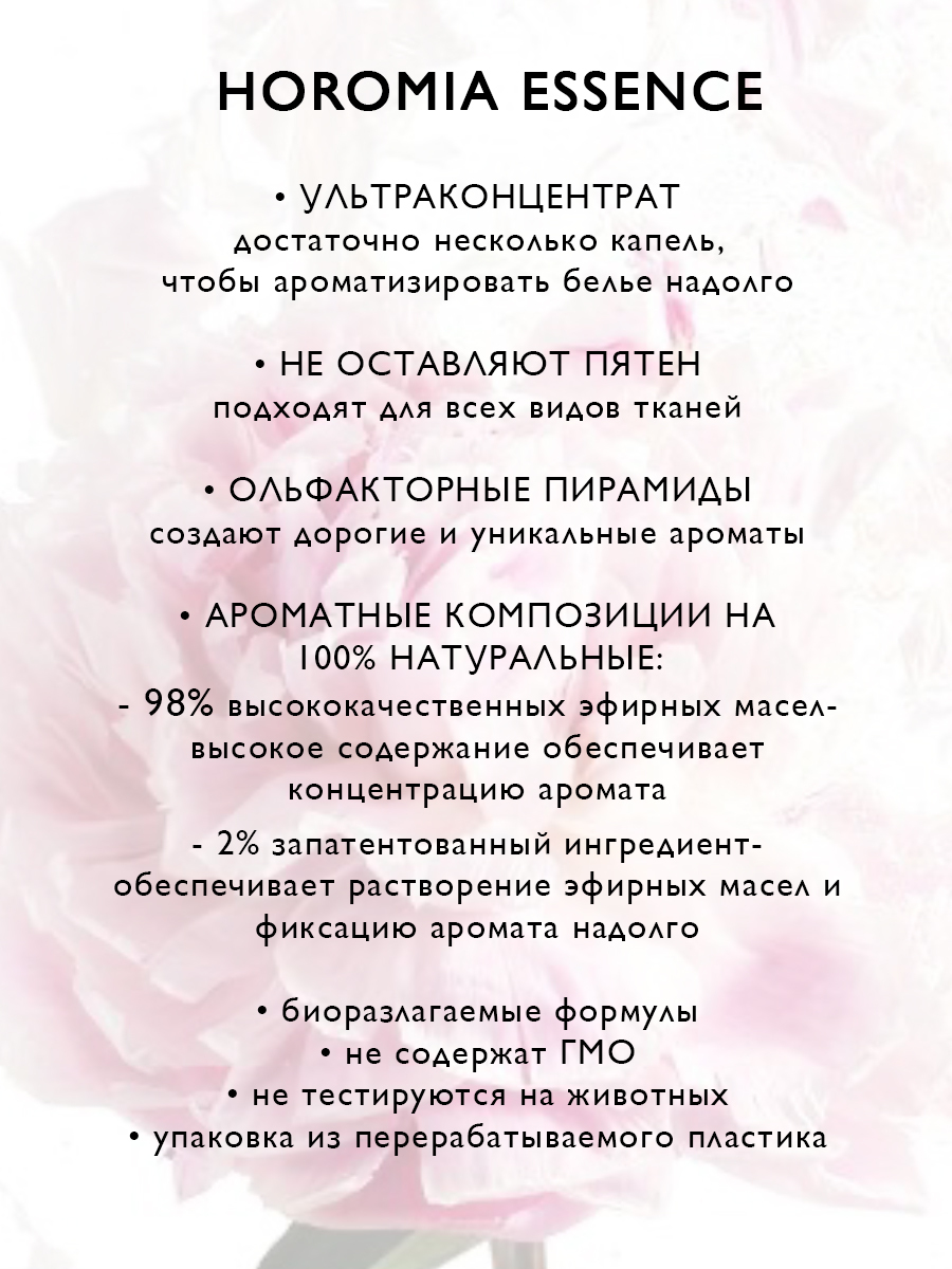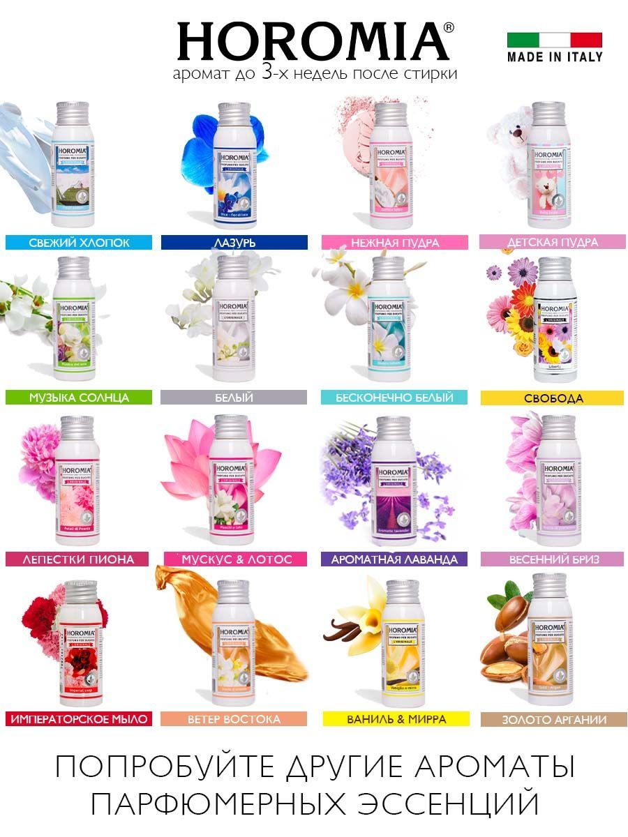 Описание: Цветочный, свежий, пудровый аромат детства.Верхние ноты: гелиотроп, жасмин, флер дОранж.Средние ноты: цикламен, ирис, имбирь.Нижние ноты: тальк, белый мох, пачули. Horomia Essences - высокая парфюмерия для белья, аромат которого дарит неповторимый стиль и комфорт на много дней. Благодаря инновационной формуле, всего лишь несколько капель парфюмерии Horomia, добавленных в стиральную машину, ароматизируют белье надолго, даже после 3 недель стирки. УЛЬТРАКОНЦЕНТРАТ. ВСТРЯХНУТЬ. В СТИРАЛЬНОЙ МАШИНЕ: налейте в отсек, предназначенный для последнего полоскания, 10-20 мл средства в зависимости от интенсивности аромата, который хотите получить.В СУШИЛЬНОЙ МАШИНЕ: налейте несколько капель на носовой платок или кусок ткани и поместите его в сушилку. РУЧНАЯ СТИРКА: добавьте 10-20 мл продукта на каждые 5л воды при последнем полоскании.
