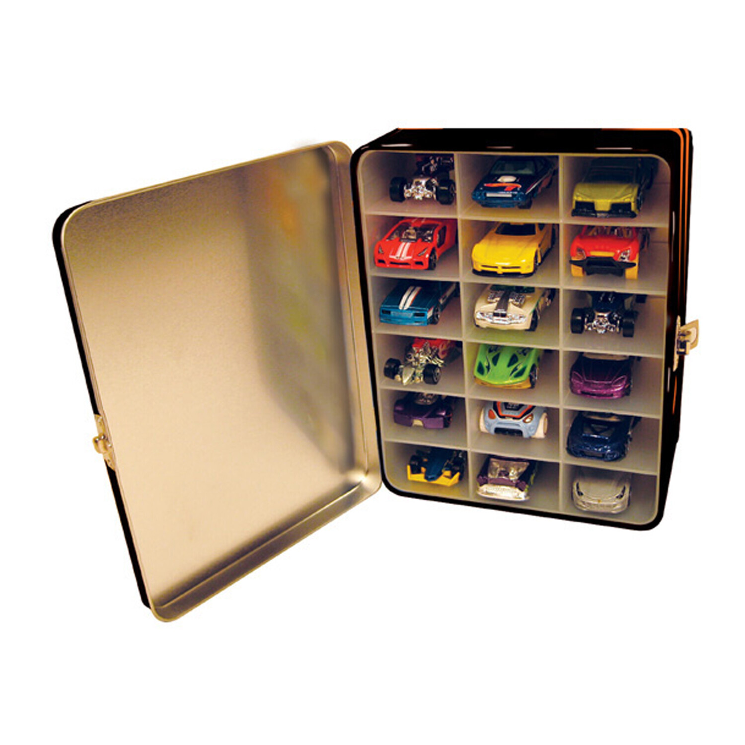 Прочная, яркая металлическая коробка с рельефным изображением машинок Hot Wheels на лицевой части. Закрывается гараж Hot Wheels сбоку на металлический замочек. Внутри вкладыш из ПВХ с 18 ячейками 4,7 см*7,5 см 3 см для удобного хранения машинок.